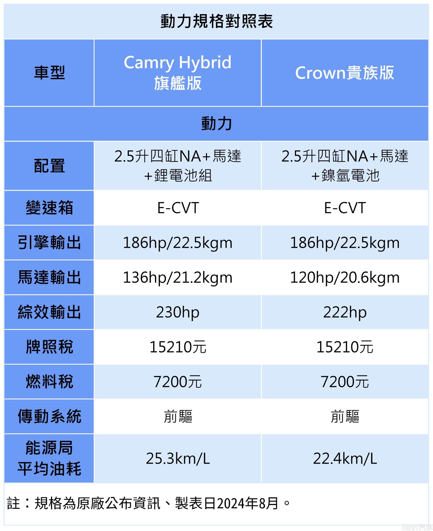 兩車皆採用2.5升油電動力,牌照、燃料等稅金相當,不過差異在於,Camry Hybrid導入第五代油電系統,配備新型PCU動力控制單元,搭配的電池也從原本的鎳氫升級為鋰電池,使得馬達輸出、最大綜效馬力、平均油耗都有所提升。