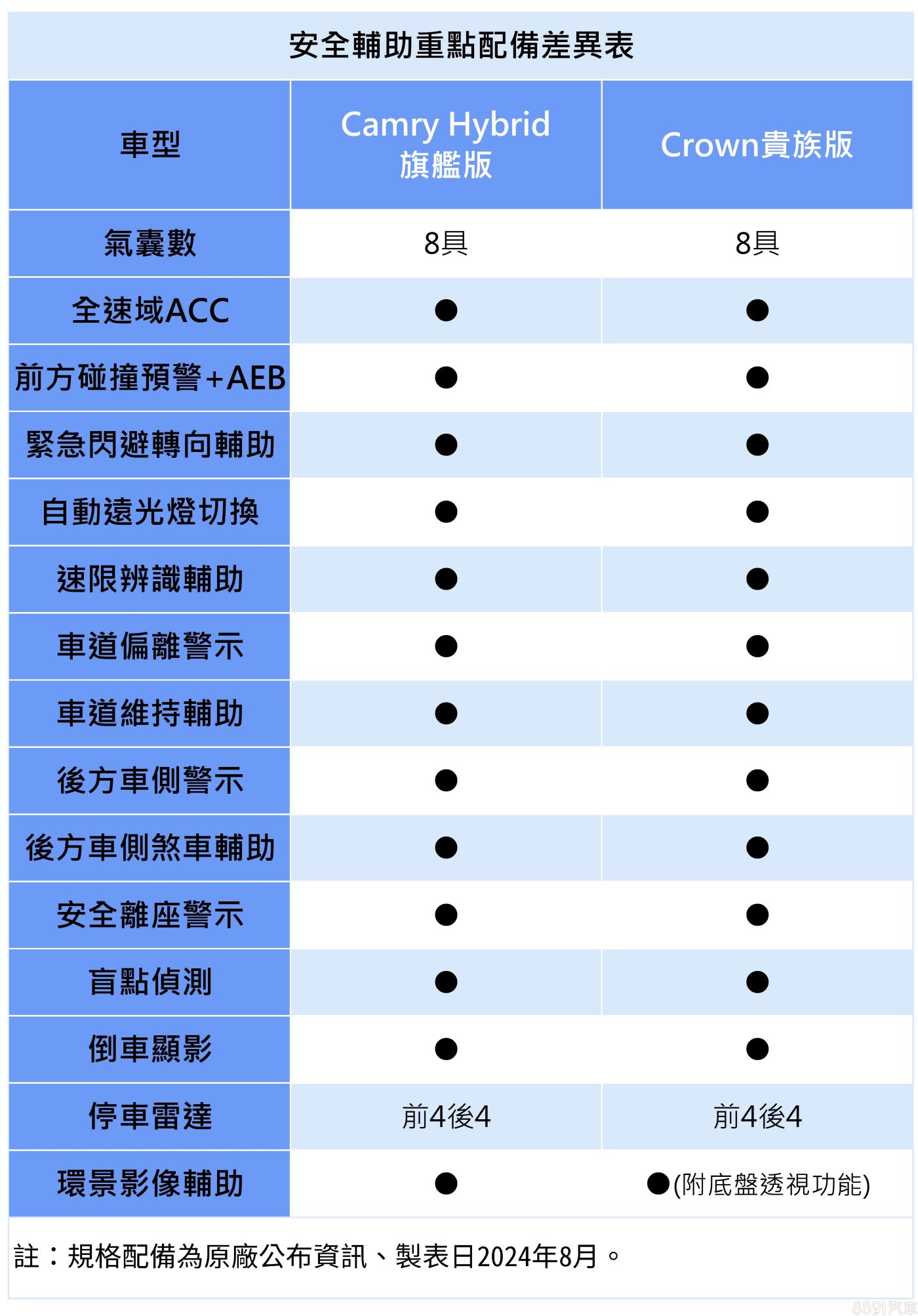 Camry與Crown皆搭載符合Level 2標準TSS 3.0,包含全速域ACC、車道維持、盲點偵測、速限辨識、後方車側煞車輔助、安全離座警示樣樣不缺,駕駛輔助功能都很齊全,稍有不同的是Crown的環景系統,還多了底盤透視功能,穿越地形、壓過爛路時能有影像輔助,行車時多了一分保障!