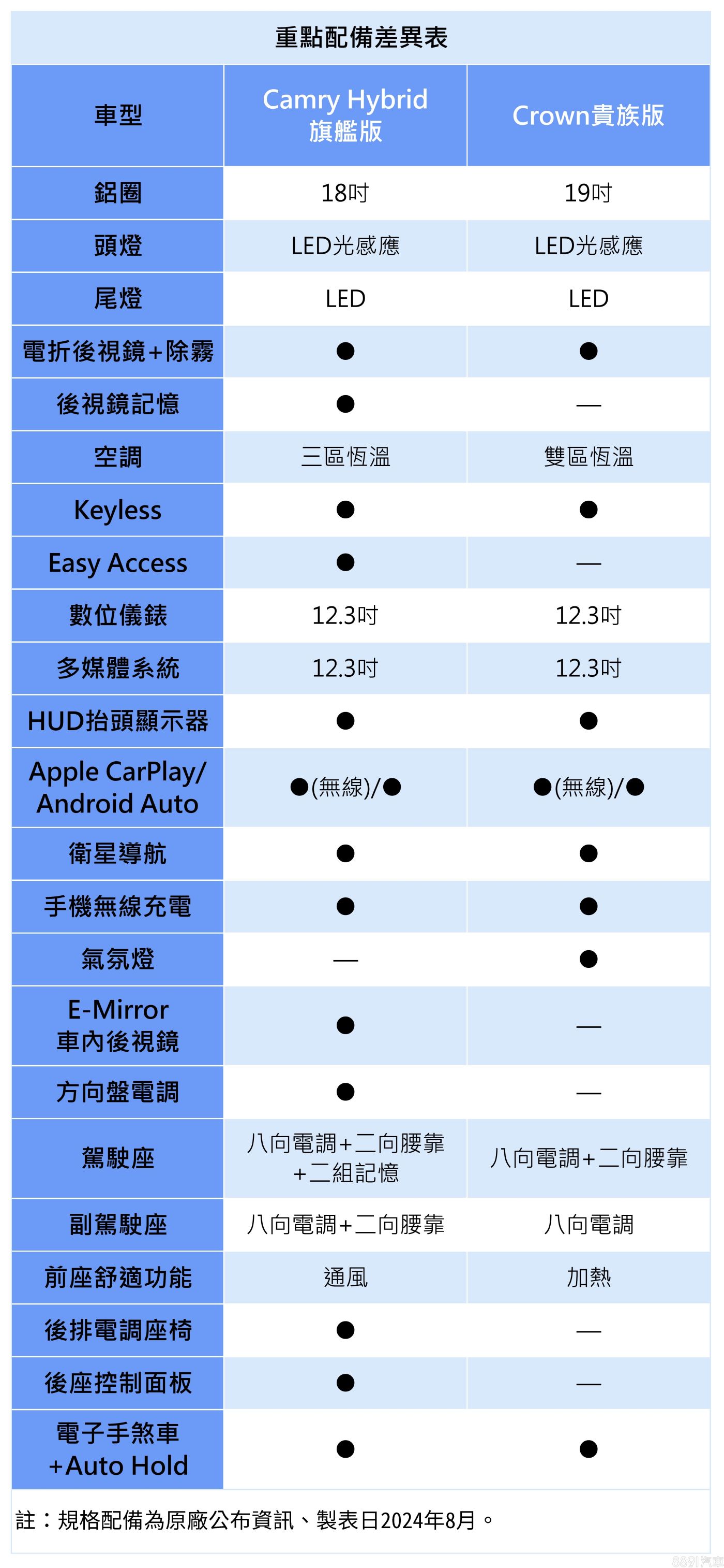 新一代Camry沿用相同的TNGA-K平台打造,整體身形、車身鈑件都維持與舊款相當,就官方公布的數據來看,兩車比起來,Crown車長較長、軸距多了25mm,而實際量測後排膝部也更加寬敞,對於乘坐舒適度有加分。不過若要說兩車最大差異,還是在車高部分,Crown設計融入跨界元素,底盤離地高比Camry這類傳統轎車更高,穿越地形能力會更為出色。