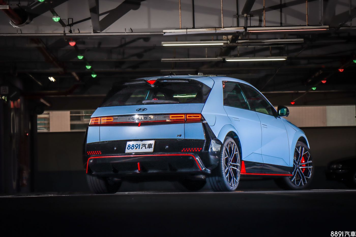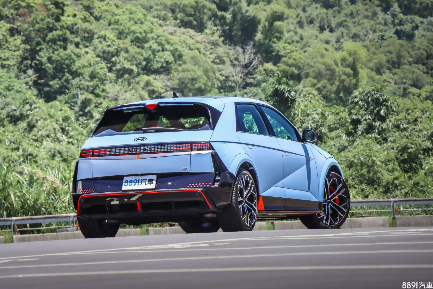 後方視覺感同樣強烈,下保桿加入大量黑化元素,配上更大面積的後下擾流、尾翼,尾翼中間還有第三煞車燈,還有個小地方不同於台灣現售的Ioniq 5,就是後檔風玻璃多了雨刷。