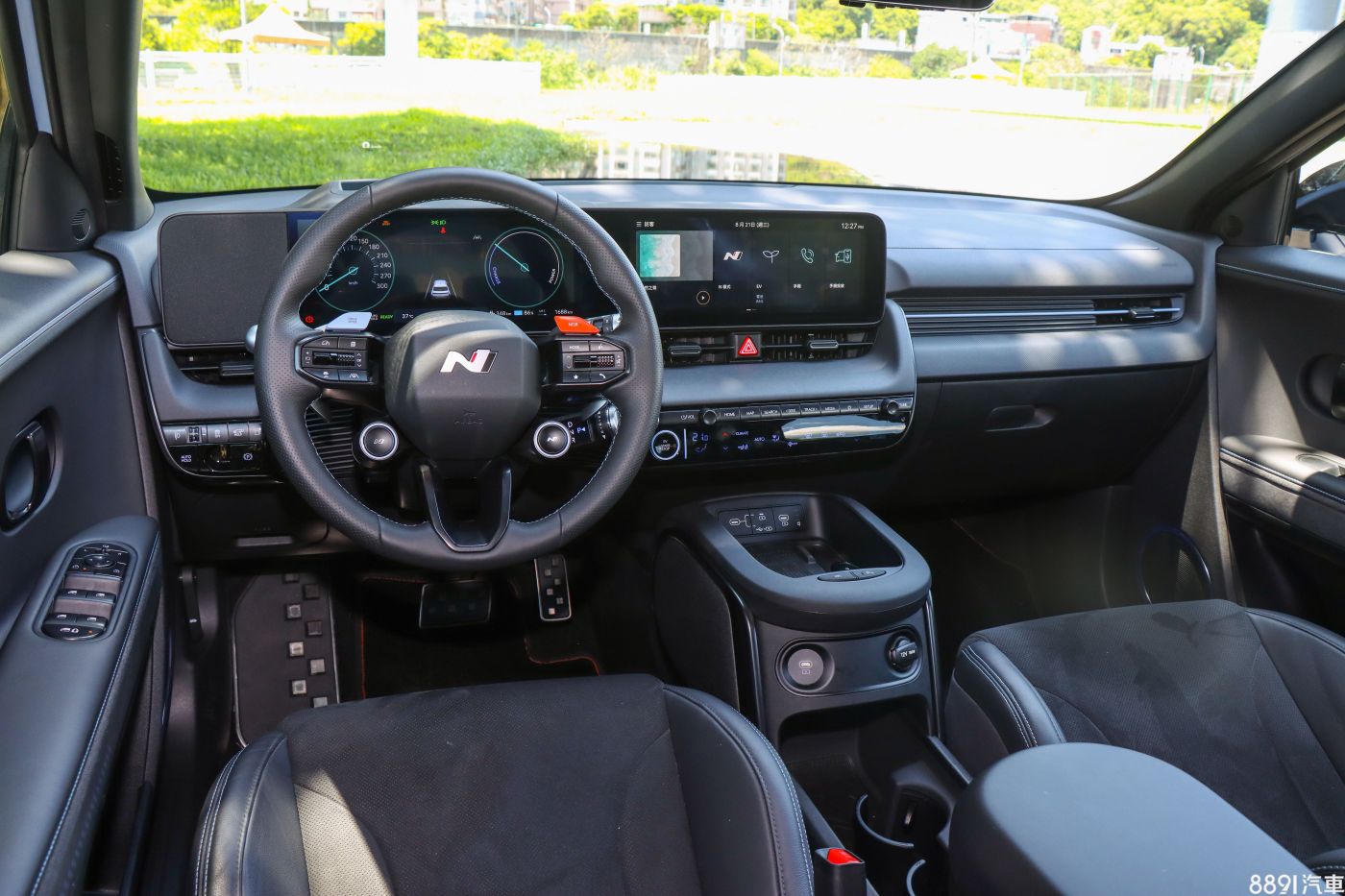 內裝以黑色系為基調,專屬的N方向盤、數位介面,中央鞍座設計也與一般Ioniq 5不同,加上前座兩張賽車椅,整體性能氛圍很夠,一般Ioniq 5主打家用舒適,買到N當然想更熱血,感受差異夠大,針對性能車的專屬設計到位。