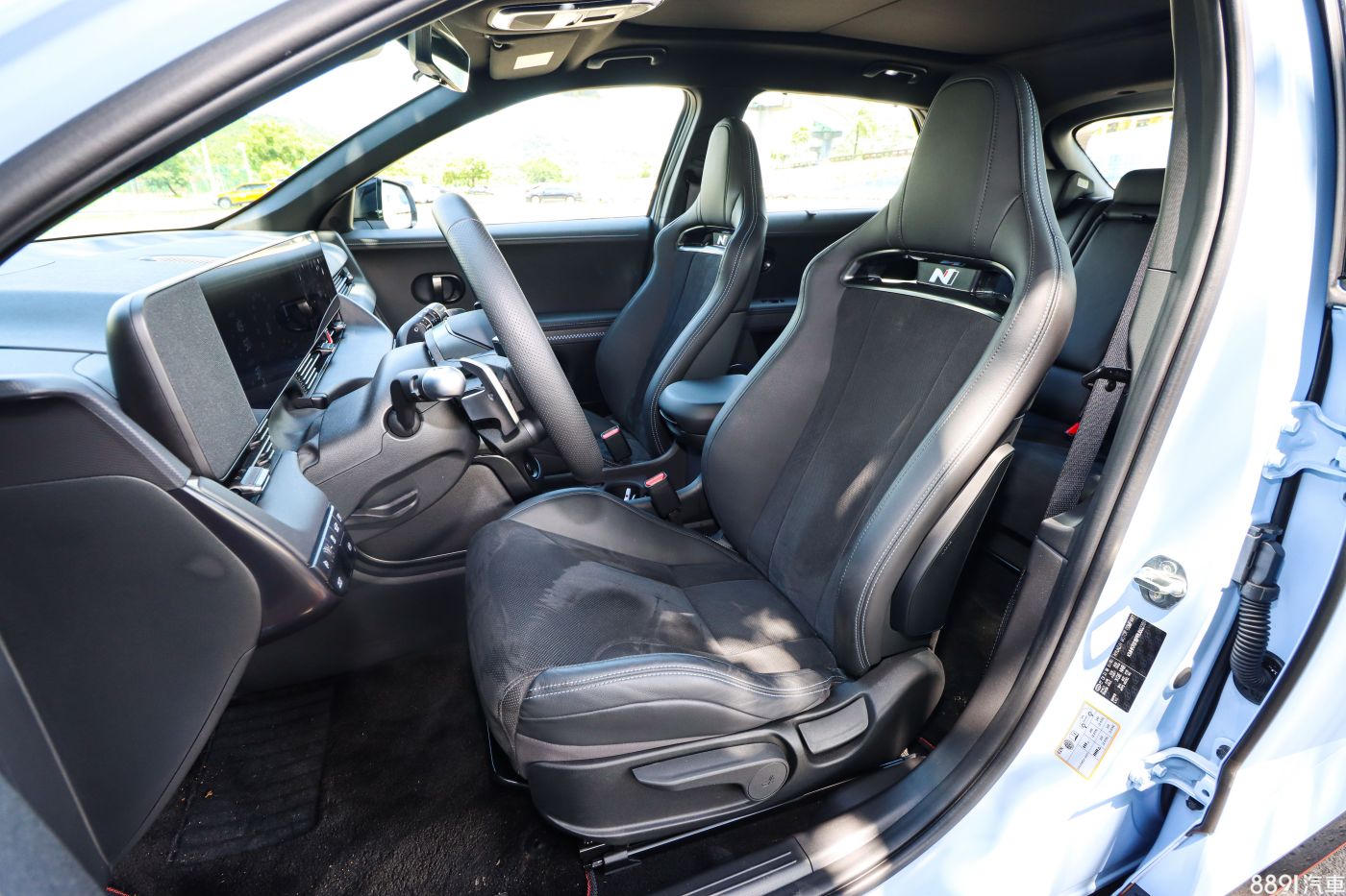 雙前座椅為手動調整,腰部、肩部、腿部包覆性都很好,一樣有通風、加熱功能,個人感覺乘坐重心比一般Ioniq 5更低,座椅上的N在晚上還會發光。