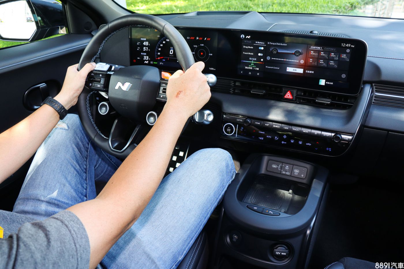 一般Ioniq 5中央鞍座為滑動式設計,會有左右連通的開闊感,但N的一體式鞍座設計會加強的座艙包圍感,腿靠設計也較有利於激烈操駕。