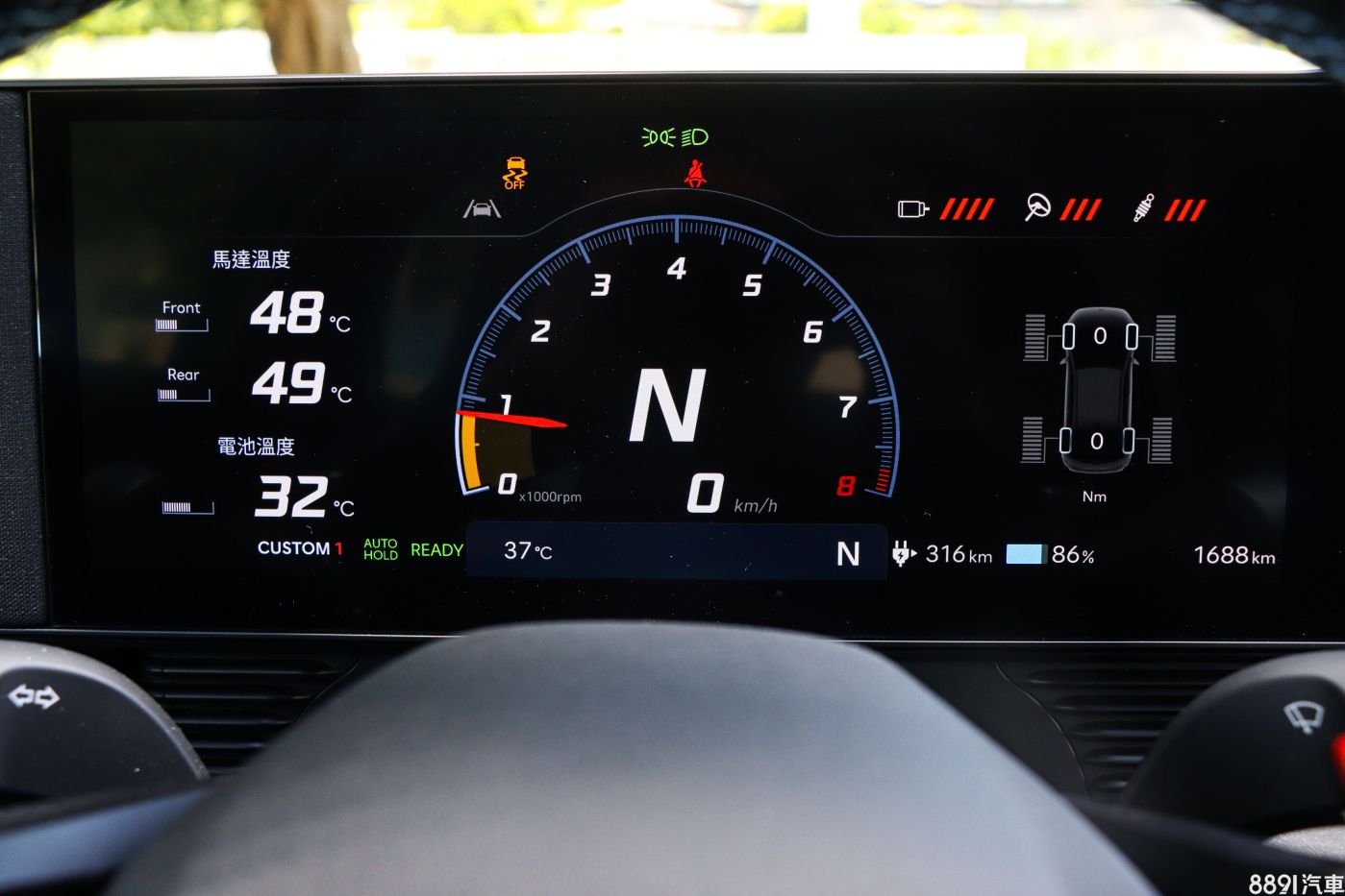 儀錶板在N模式有專屬介面,左邊直接顯示馬達溫度、電池溫度,右邊可以看到目前馬達、轉向、懸吊模式,像是G值顯示、單圈計時也會在右邊,視覺簡單好辯讀,但與雙B性能車相比不算花俏。