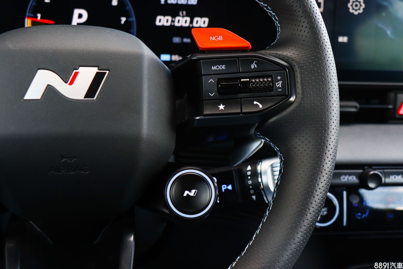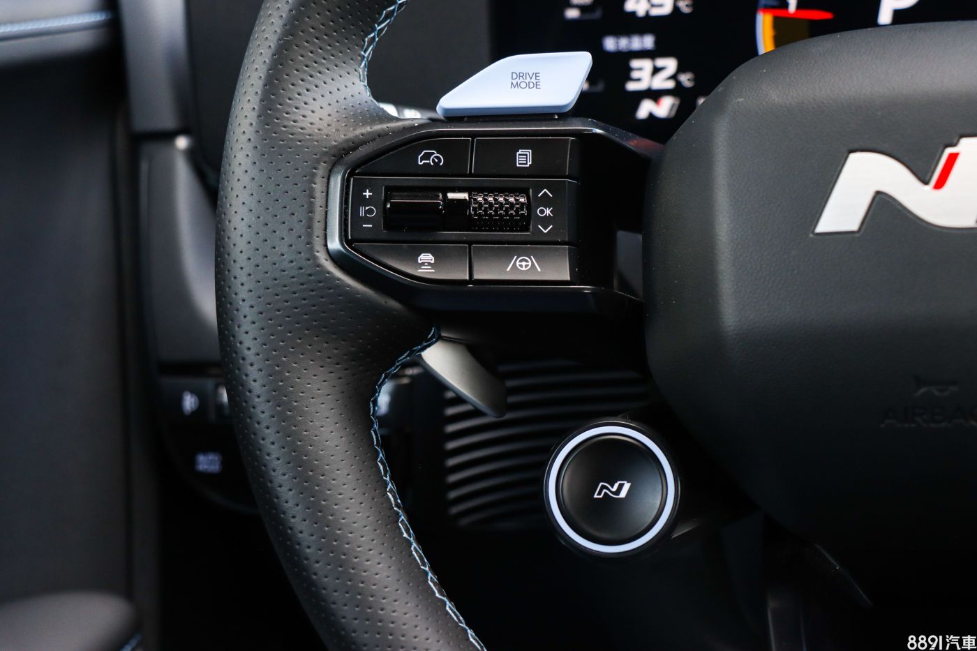 N方向盤功能很多,上頭設有4個快捷按鍵,左上可以設定Eco、Normal、Sport三種駕駛模式,左下的「N」按下去會有更進階N Drive Mode,你可以一鍵進入最激進狀態,也能切換2組自訂義N駕駛模式。