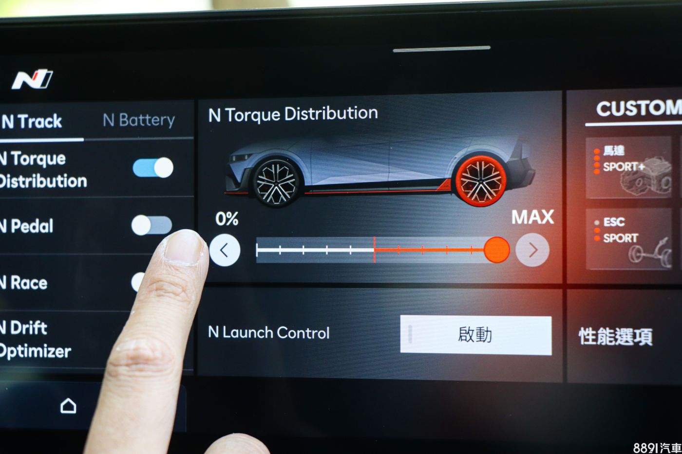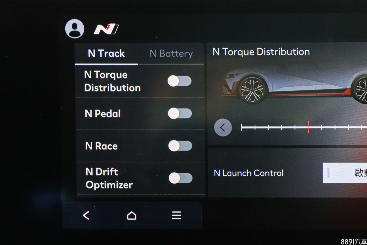 在N Drive Mode畫面左側有很多好玩功能可選,前後驅比例調整、模擬換檔、甩尾模式,甚至是可以用N Battery來改變電池溫度,提供賽道、彈射起步兩種狀態下的最佳電池溫度調整。