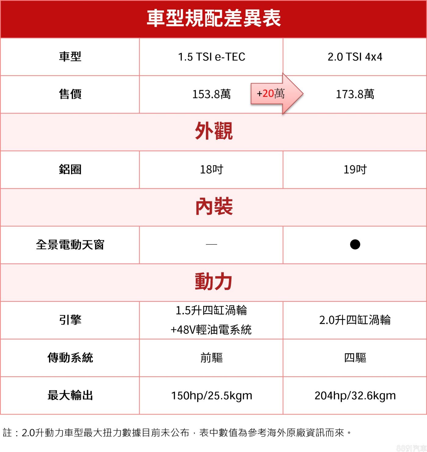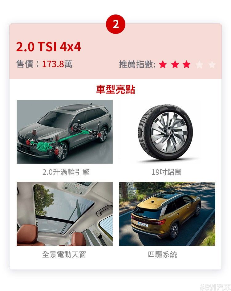多花20萬的高規版,換來輸出更大的2.0升動力以及四驅系統,鎖定的是有動力及基本越野需求的買家,不過稍嫌可惜的是,配備方面除了升級19吋鋁圈、電動天窗外,就沒有太多亮點,少了一點頂規的獨特性,對預算有限的買家也缺乏吸引力。