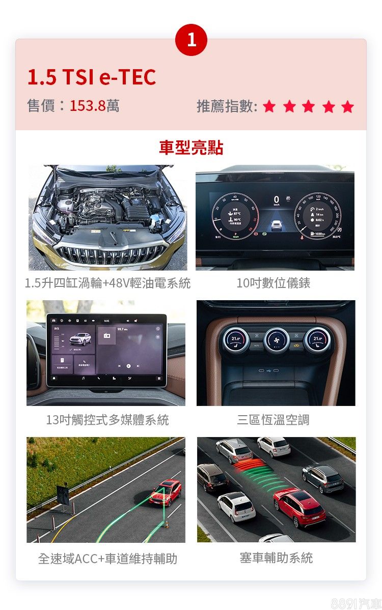 Kodiaq入門配備就給的很豐富,像是Matrix LED頭燈、發光水箱罩、電動尾門、電調+記憶真皮座椅、HUD、三區恆溫、車室氣氛燈、14具揚聲器Canton音響、360環景應有盡有,甚至還可無料選擇棕色內裝,高級感大加分,而這些都是印象中在他牌需中高階才有的配備,Skoda標配給你,產品力沒話講,同級最暢銷絕非僥倖!至於動力部分,以個人經驗分享,該1.5升動力,再加入48V輕油電之後,起步輕快、動力銜接也順暢,重點是省油也省稅金,除非你真的很喜愛性能,否則無需多花20萬攻頂,買「1.5 TSI e-TEC」就已經面面俱到。