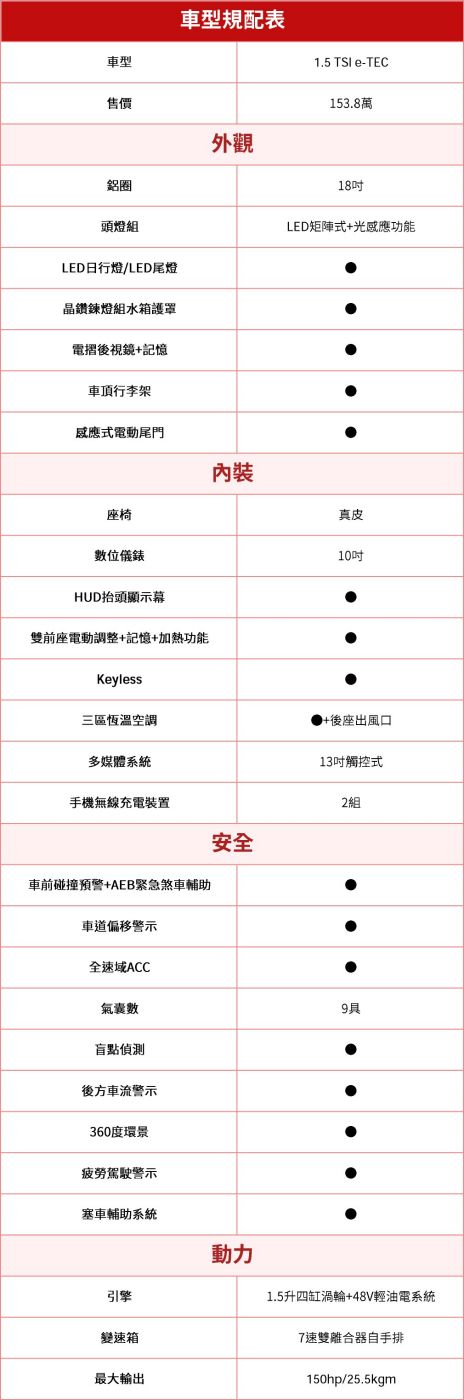 1.5升動力結合48V輕油電,同時也導入ACT+汽缸歇止系統,目的是為了提升節能表現,能源局平均油耗16.8km/L,相比舊款的15.0km/L進步不少,長期使用下來,確實能省下不少油錢;至於2.0升動力,國內尚未公布最大扭力,表上數值是參考自海外原廠資訊。而除了動力配置不同外,兩版本牌燃稅也正好差一級,每年要繳的稅金差了約5500元。
