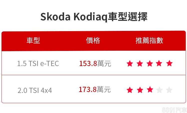 Kodiaq車型設定很簡單,就是「1.5前驅」與「2.0四驅」各設定一個車型,兩者除了動力配置有別之外,其實配備差異並不明顯,入門款就已經「給好給滿」,舒適內裝、安全輔助樣樣不缺,1.5升動力+48V輕油電的組合,帶來省油及低稅金優勢,150萬出頭就能買到大滿配的七座休旅,論C/P值確實最推薦給普羅買家,至於攻頂的2.0升動力,配備升級不多,主要是獻給更在意性能的買家。
