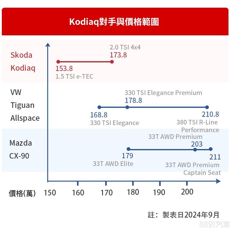 國內進口七座休旅市場小眾,同價位能選的車款並不多,即便新一代Kodiaq入手門檻提高3萬,但153.8萬的起售價,依舊是同級最便宜。同集團的VW Tiguan Allspace算是最直接的對手,但產品已屆末期,科技感、新鮮度都比不上,Mazda CX-90雖然是全新車系,但較高的定價,加上大排氣量的稅金,恐會讓預算型買家打退堂鼓。