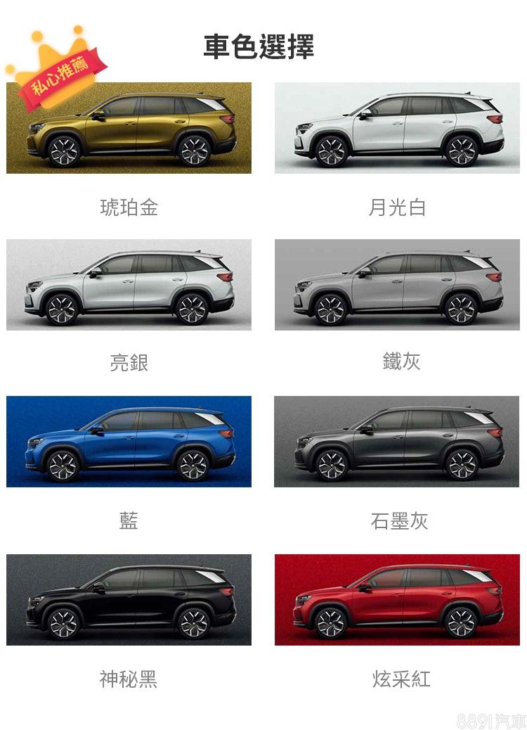 Kodiaq車色選擇不少,除了常見的白、銀、灰、黑等大眾色系外,也有提供深藍、鐵灰、炫彩紅、琥珀金等繽紛色系,讓這輛家庭取向的七座休旅看起來很新潮,更容易吸引年輕客群,其中琥珀金是大改款後新增車色,看過實車,色澤奔放有質感,開上路絕對吸睛。