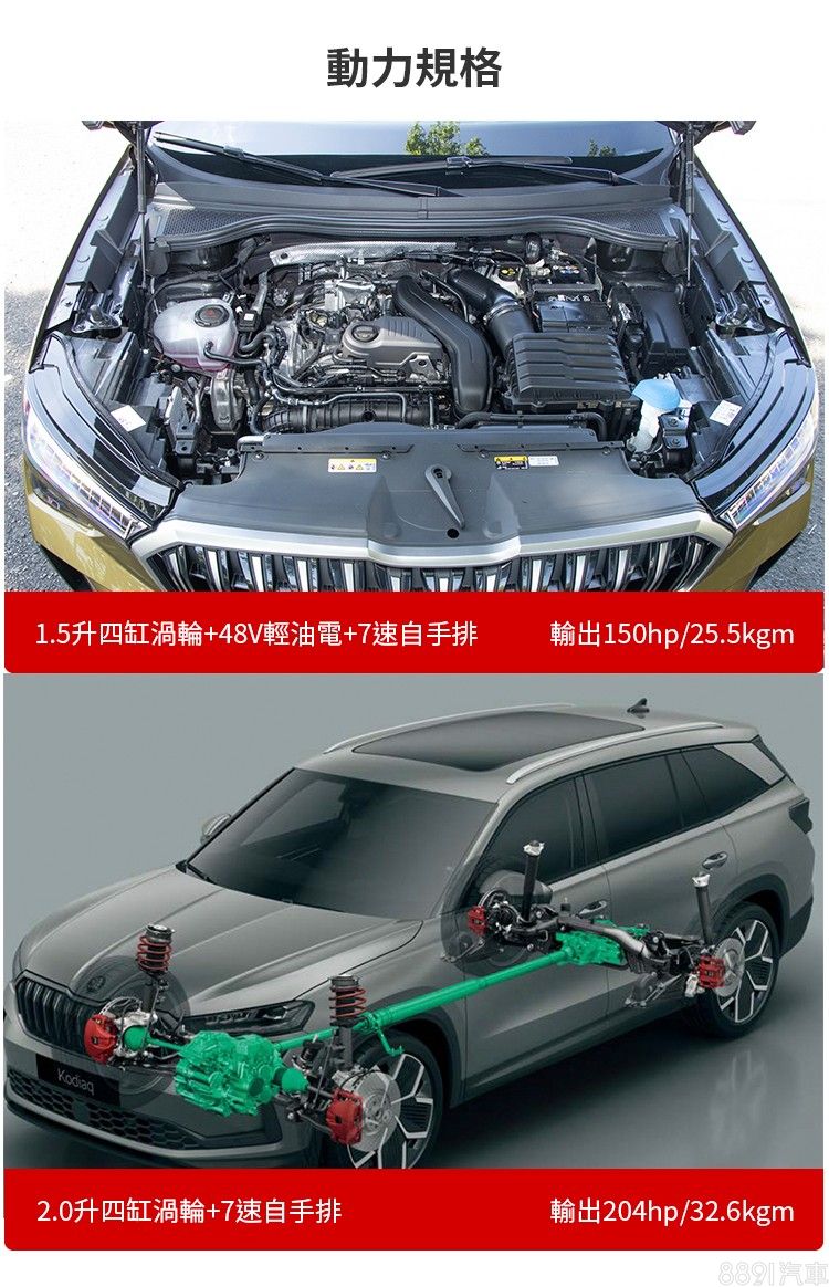 新一代Kodiaq維持2種動力編成,入門款採用1.5升四缸汽油渦輪+48V e-TEC輕油電,高規搭載2.0升四缸汽油渦輪,輸出分別150hp與204hp,均搭配7速雙離合器自手排變速箱,後者另為四輪驅動設定,並且兩車型皆可選配DCC Plus電子懸吊系統。