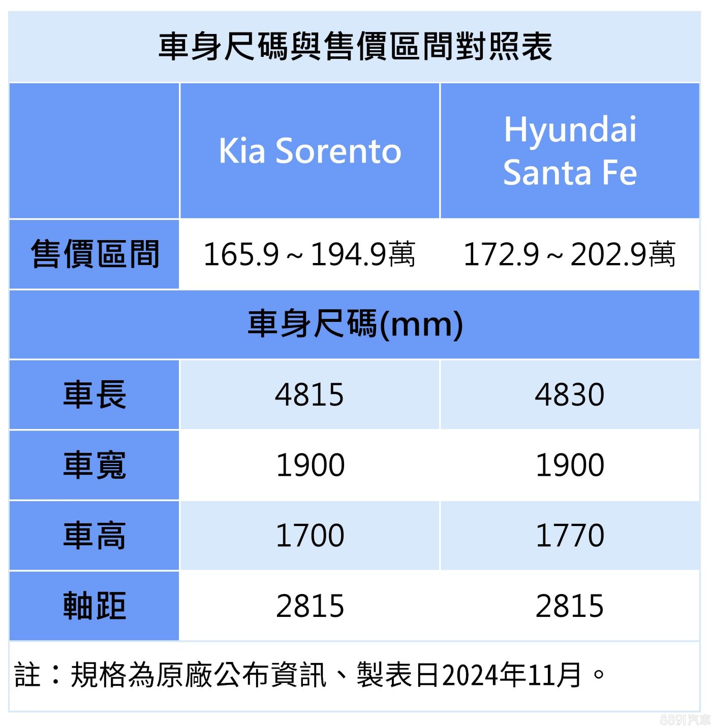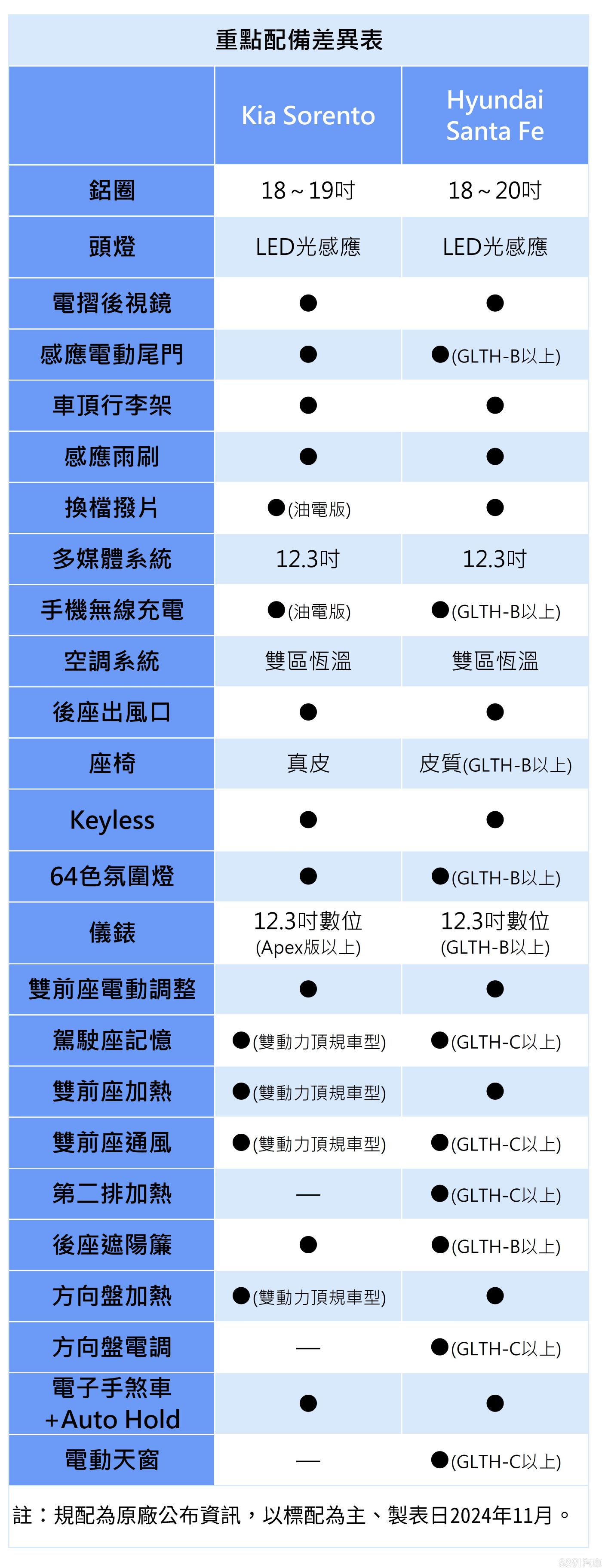 新世代Hyundai Santa Fe祭出氣勢磅礡的外觀扮相、科技感十足的內裝,且舒適配置與質感呈現更講究,看起來真的夠香!相較之下,Kia Sorento內外僅是小針美容,新鮮程度不如對手,但細看會發現,小改款後新增不少好料,主打的舒適配備也旗鼓相當,加上多元動力及較低的入手門檻,能擴及更多買家,這似乎讓Sorento有了和大改款Santa Fe一較高下的底氣?