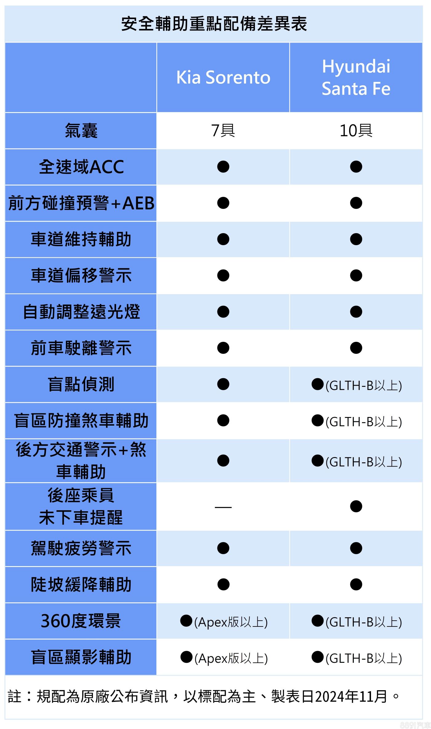 兩車皆搭載Level 2駕駛輔助,像是全速域ACC、車道維持輔助、前方碰撞預警煞車、前車駛離提醒、盲區偵測、後方交通警示、後方車側煞車輔助樣樣不缺,輔助功能都很齊全,不過細看會發現,部分項目Santa Fe要二階車型以上才有,Sorento則是全車系標配,安全不分等級;要說兩者明顯差異之處,Santa Fe標配10氣囊,比對手多了駕駛座膝部及第二排雙側邊氣囊,對駕乘者保護更全面,而後座乘員未下車警示,也能提醒粗心的父母,避免遺忘後座的小孩或寵物。