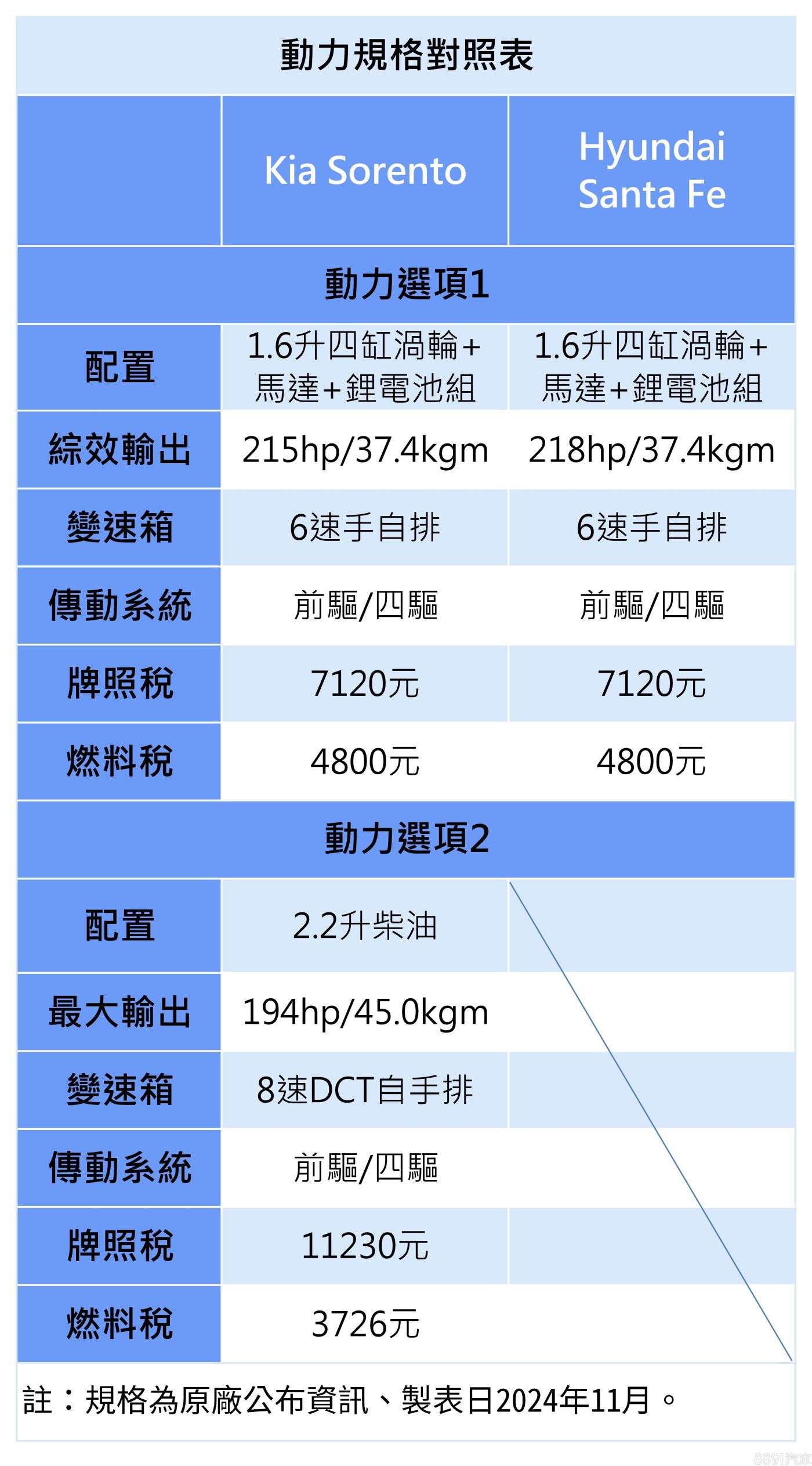 兩款休旅皆有提供油電動力,是由1.6升四缸渦輪+電動馬達+1.49kWh鋰電池組成,不過改款後引擎輸出調降、綜效馬力也跟著下修,據說是為了對應新的歐盟排放法規而做的調整;柴油動力方面,新一代Santa Fe已不再引進,只能選Sorento了。