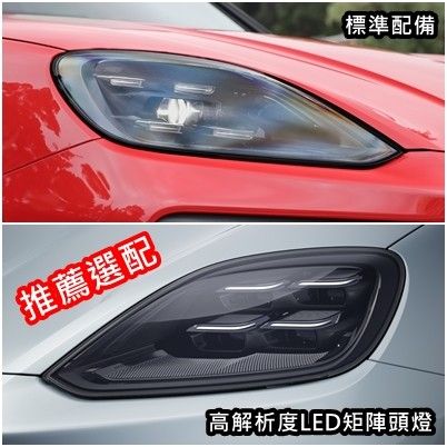 試駕車搭載標準LED矩陣式頭燈,裏頭燈組佈局是家族化設計,四個光點亮起,遠遠就能認出是保時捷,編輯特別推薦加選高解析度LED矩陣頭燈,擁有主動遠光燈遮蔽、轉向輔助燈,針對不同路況優化光型,達到最遠照射距離,讓夜晚視線更清晰;高階頭燈在外觀上也有些許不同,還能選配燻黑款,功能性與視覺都提升。