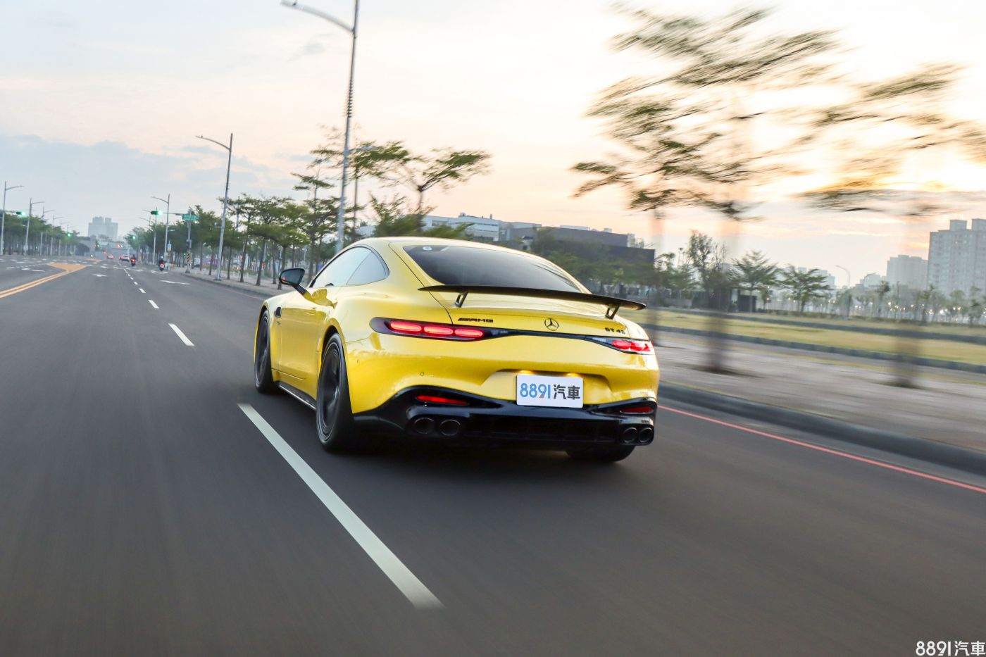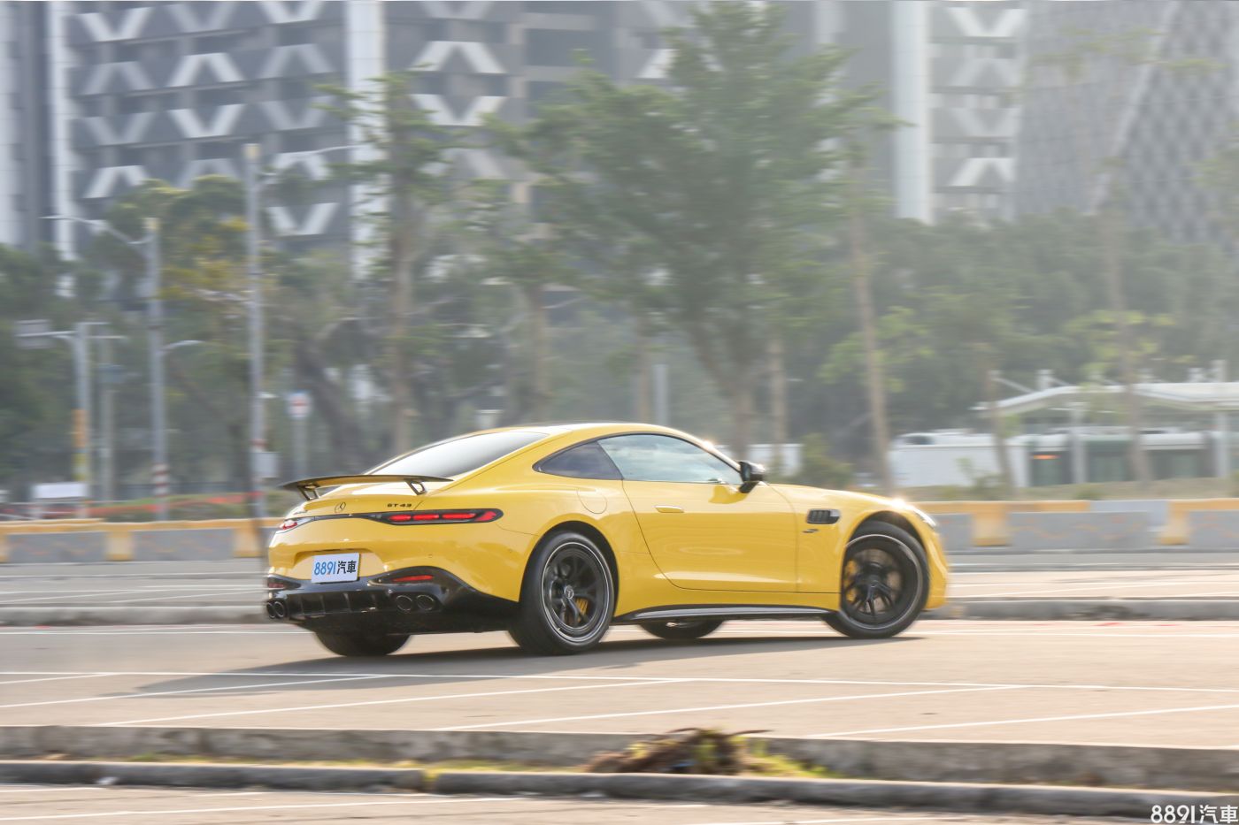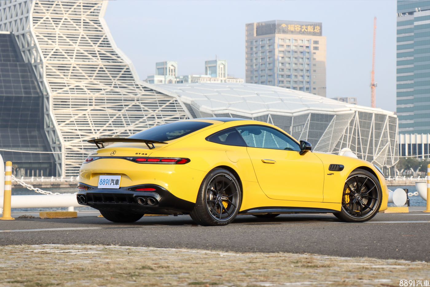 AMG GT目前提供43與63 S E Performance兩種動力,車頭保桿設計不同,GT 43橫向線條較多,前葉子板散熱孔造型也是橫式設計,車寬也窄了55mm。這輛GT 43有選配進階夜色套件(9.5萬元),因此水箱護罩、前保桿飾條、後視鏡、葉子板散熱孔造型、後窗、型號銘牌與排氣管出口都黑化處理。車色陽光黃是標準漆,無須加價也相當搶眼。