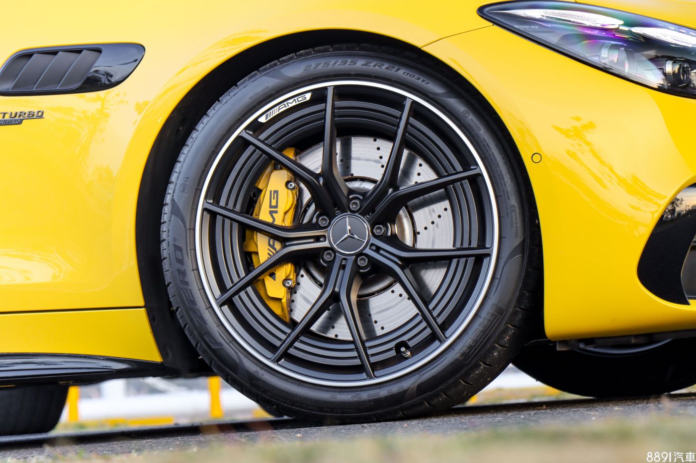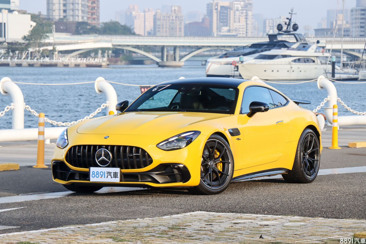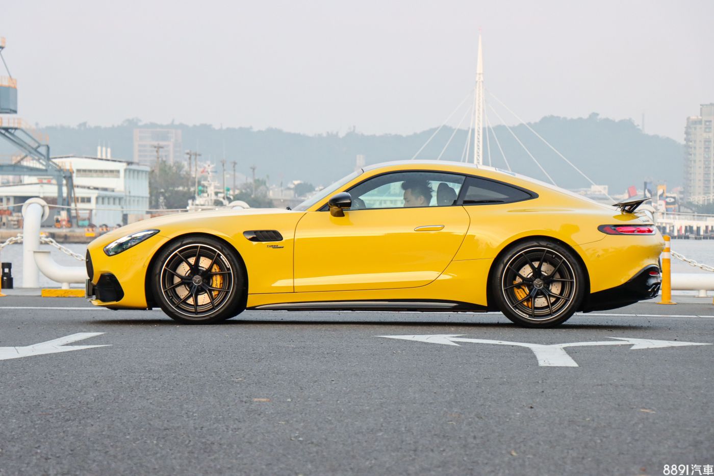 AMG GT目前提供43與63 S E Performance兩種動力,車頭保桿設計不同,GT 43橫向線條較多,前葉子板散熱孔造型也是橫式設計,車寬也窄了55mm。這輛GT 43有選配進階夜色套件(9.5萬元),因此水箱護罩、前保桿飾條、後視鏡、葉子板散熱孔造型、後窗、型號銘牌與排氣管出口都黑化處理。車色陽光黃是標準漆,無須加價也相當搶眼。