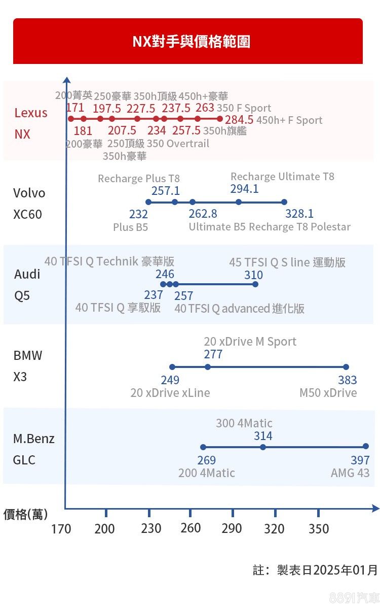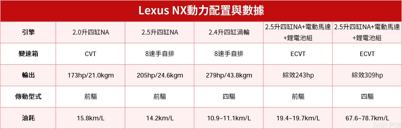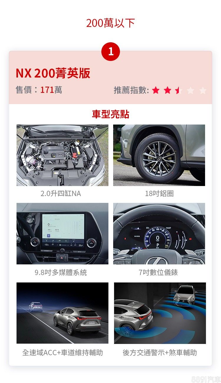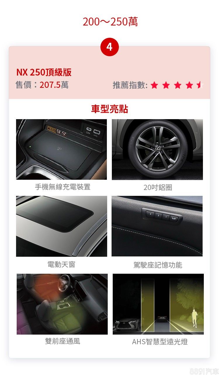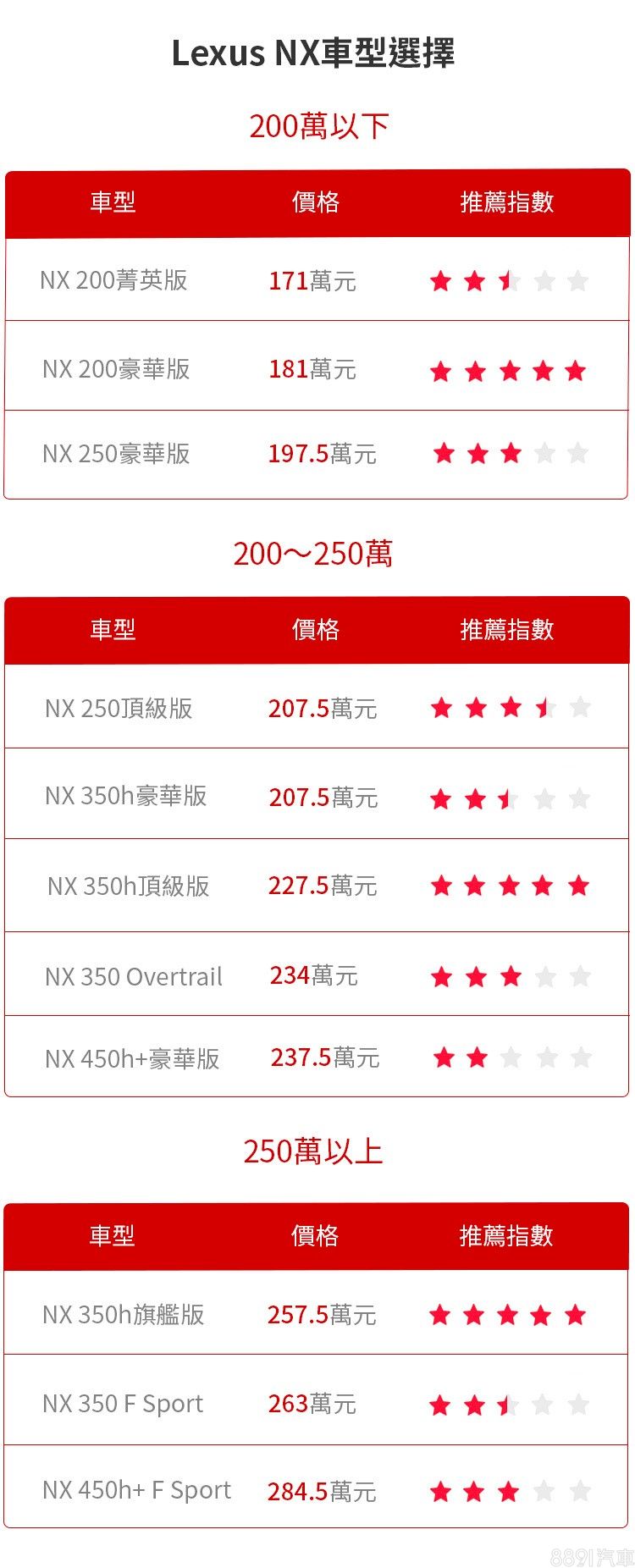 Lexus品牌力深植人心,加上屬最熱門中型SUV級距的NX,熱賣似乎也屬情理之中?不過想購入的消費者,可能容易被車系五種動力、11種車型的編成搞得「霧煞煞」,8891汽車以最重要的預算為標準,將車系區分為200萬以下、200至250萬,以及250萬以上,提供懶人包做為你購車的參考!