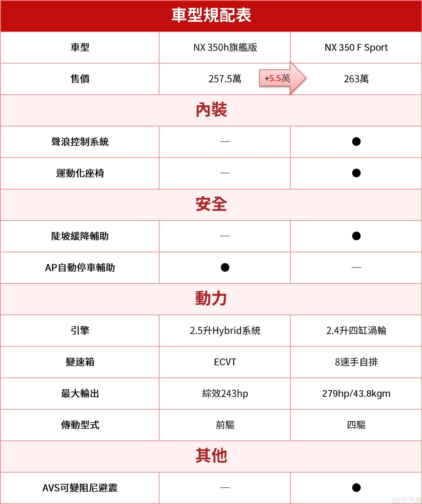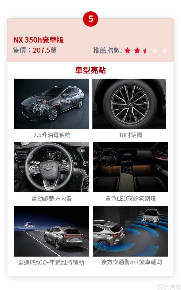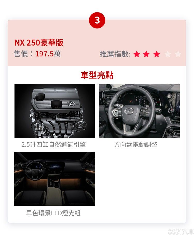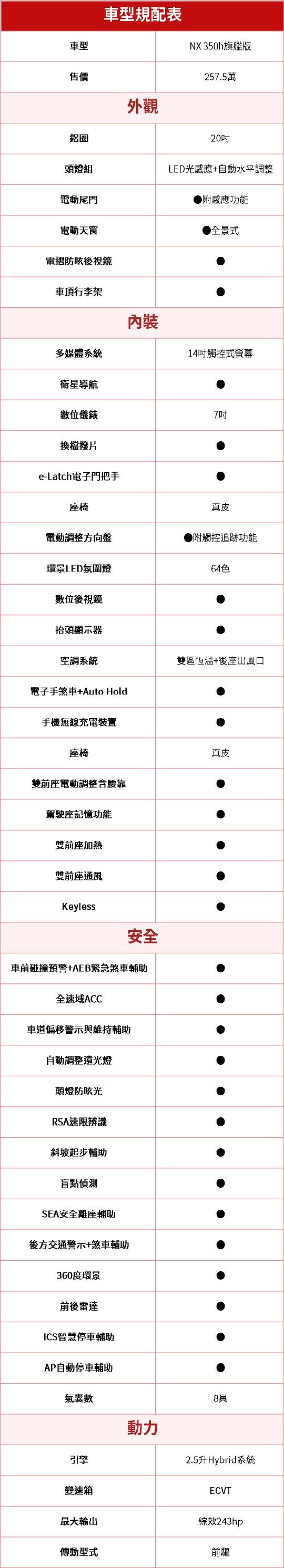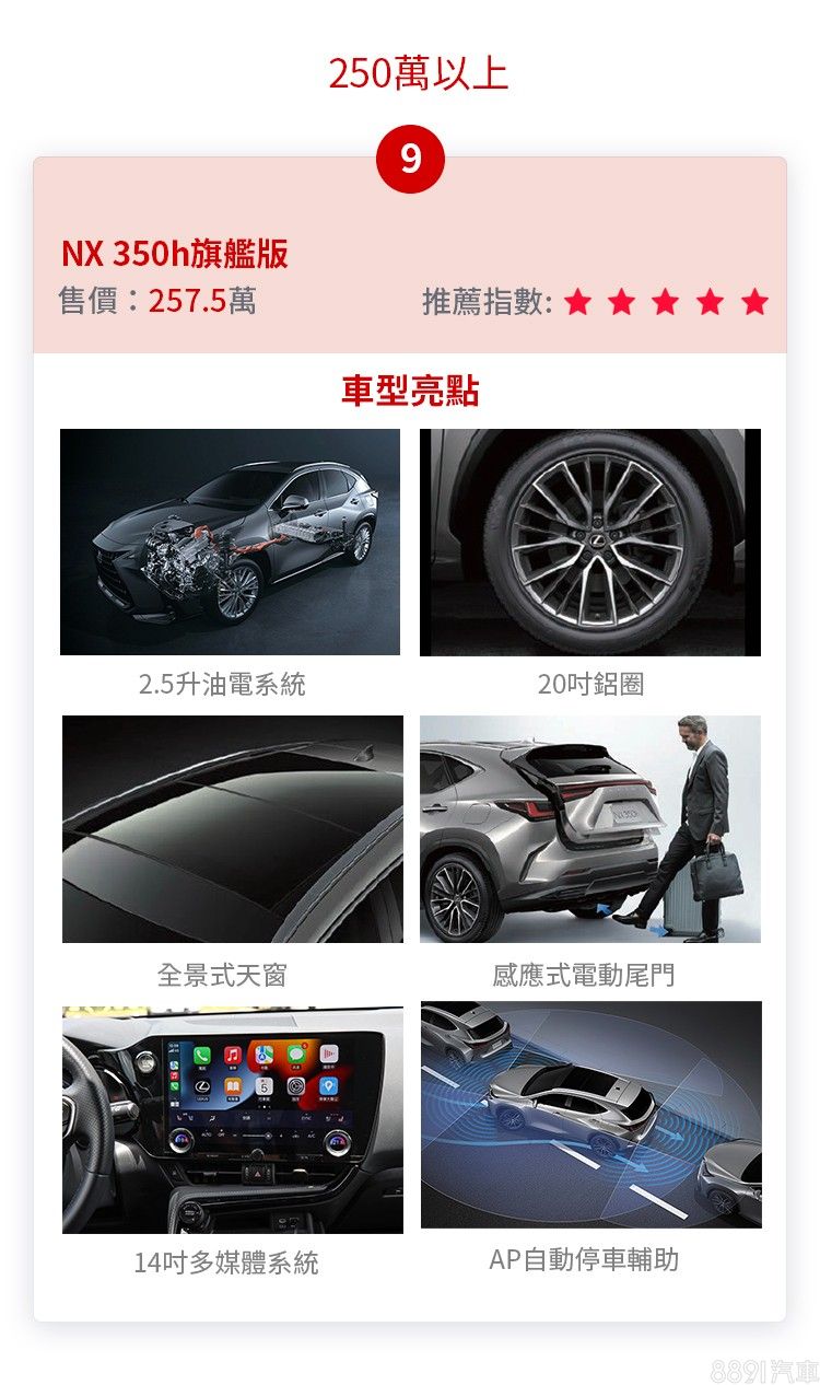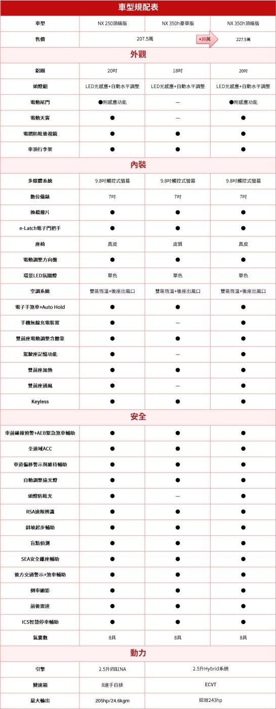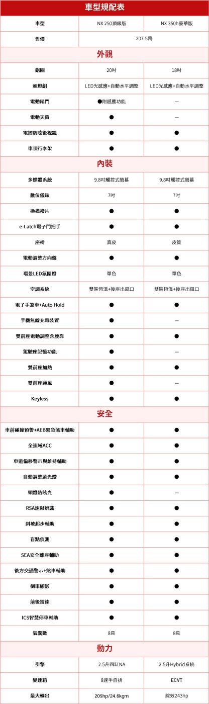 至於227.5萬的NX 350h頂級版,配備既能符合多數人對豪華車的期待,又是成熟能省油錢的Hybrid系統,是預算200至250萬間我們最推薦的NX!