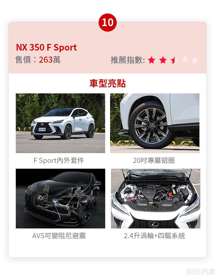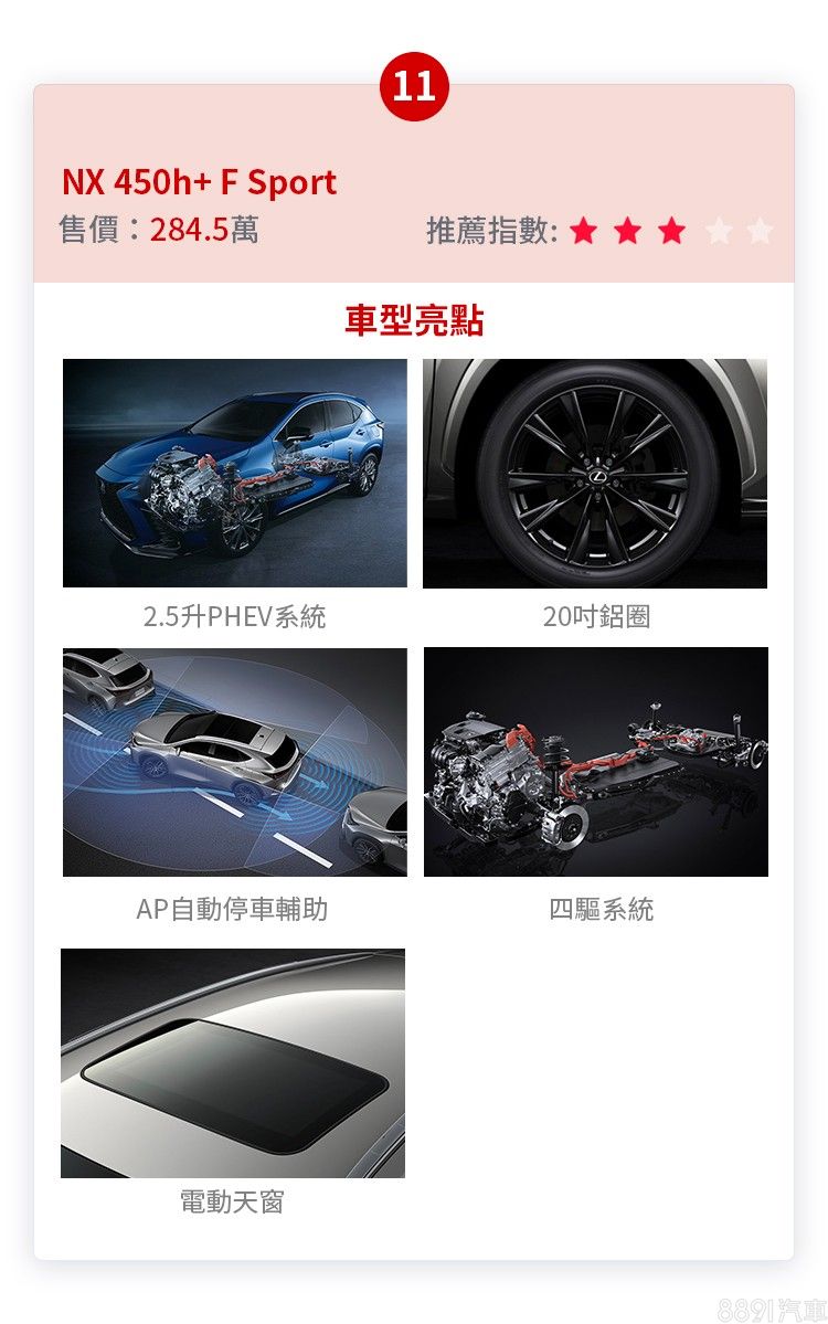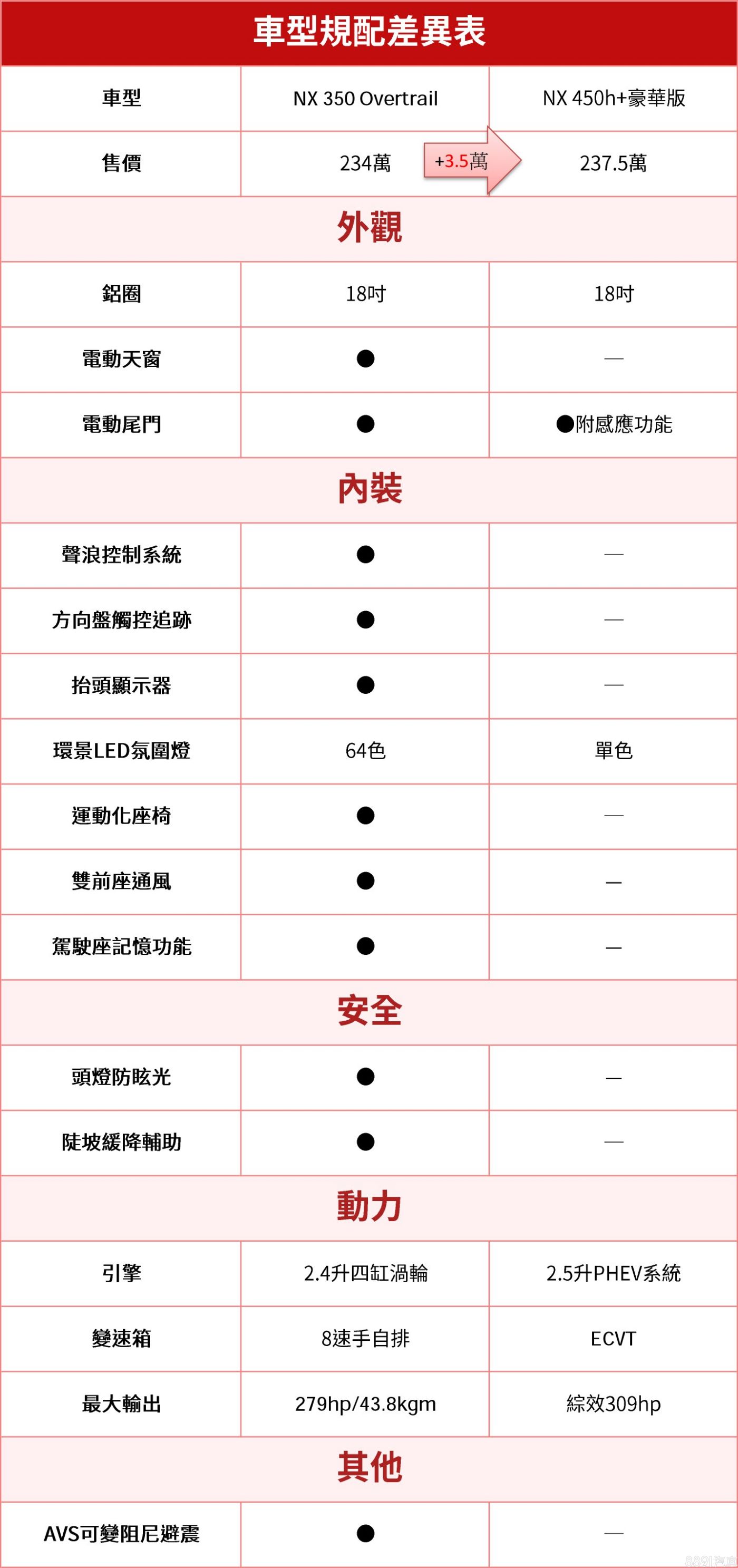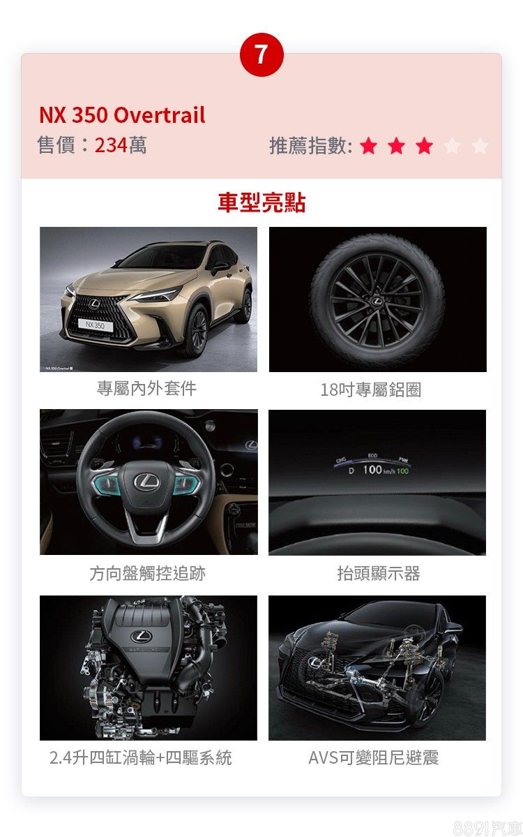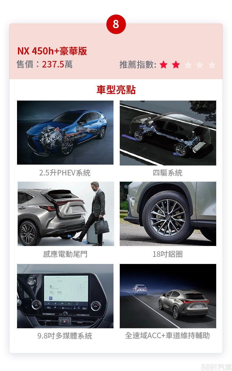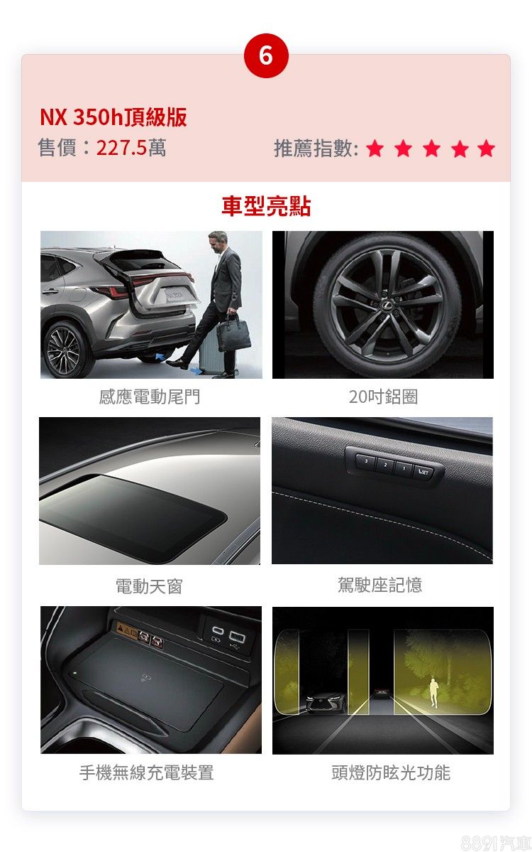 至於227.5萬的NX 350h頂級版,配備既能符合多數人對豪華車的期待,又是成熟能省油錢的Hybrid系統,是預算200至250萬間我們最推薦的NX!