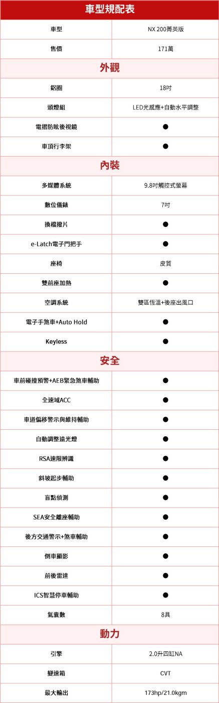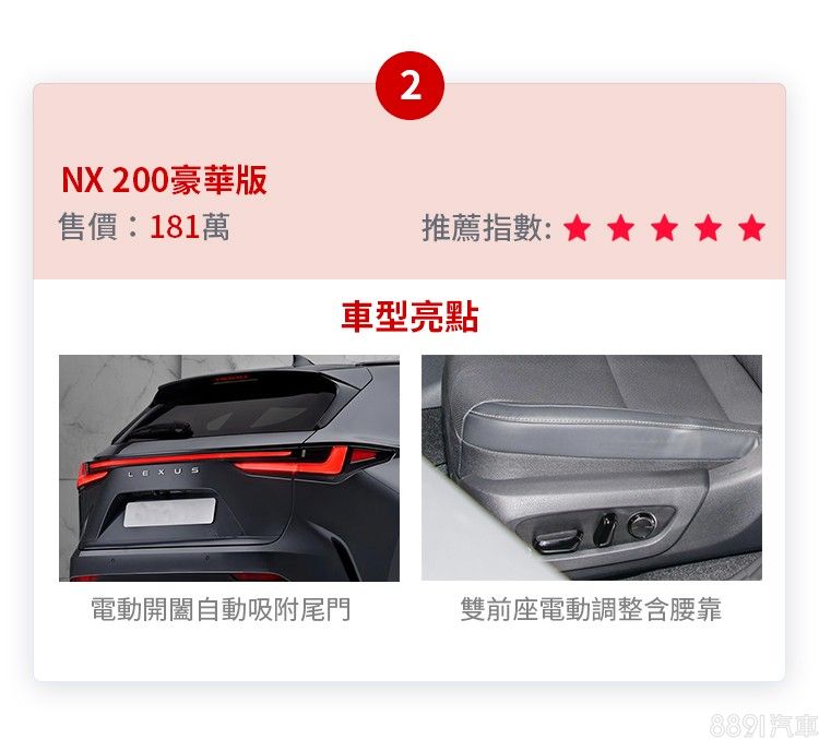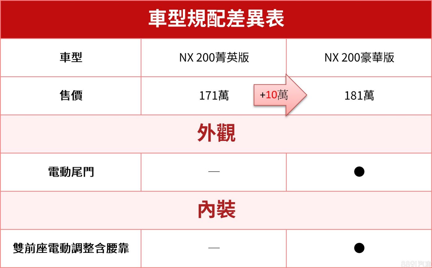 NX 200菁英版作為車系入門,171萬的售價落在平價中型休旅高規的射程範圍,雖然價格是很大誘因,但細看其配備,少了如電動尾門、雙前座電動調整等,感覺這個「崁站」該有的東西,簡單說,其定位是讓消費者進入豪華品牌的敲門磚,因此推薦指數相對沒那麼高。