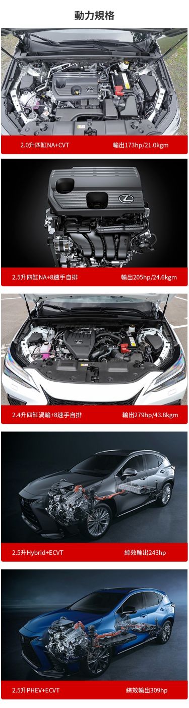 NX動力選項從自然進氣、渦輪、油電到PHEV都有,十分豐富,純燃油引擎方面,入門NX 200搭載2.0升四缸自然進氣引擎,NX 250改搭載2.5升四缸自然進氣引擎,NX 350則升級至2.4升四缸渦輪增壓引擎。油電複合動力則提供NX 350h與NX450h+兩種選擇,均採用同樣的2.5升四缸自然進氣引擎提供基礎動力,後者具備86km最大純電續航里程。
