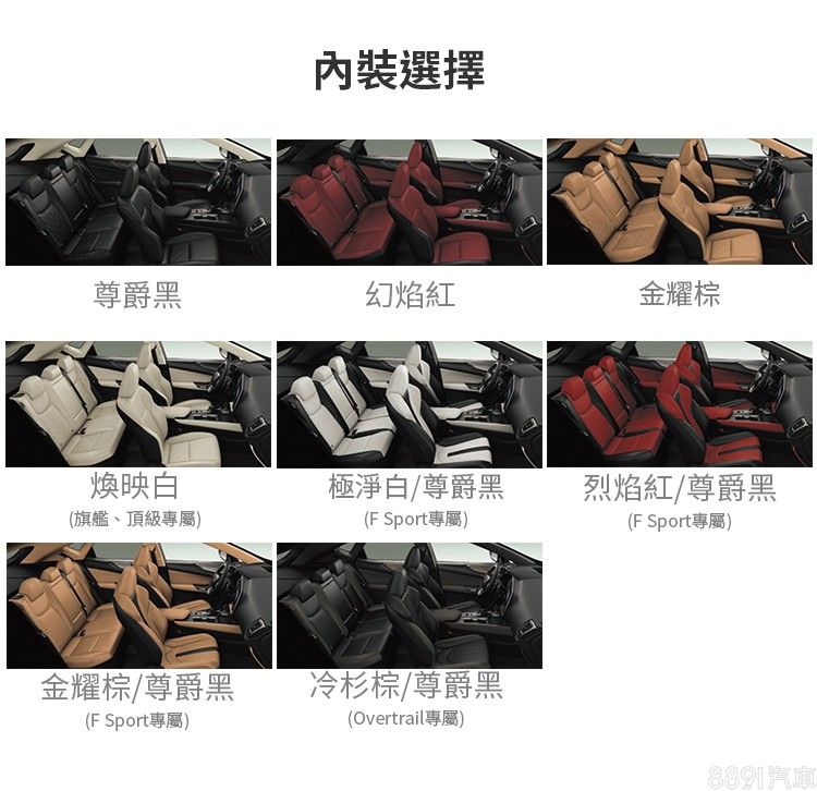 內裝提供單色與雙色多種選項,其中F Sport版本能選的花樣最多,Overtrail車型則可選冷山棕+黑的款式,質感不俗又特別。