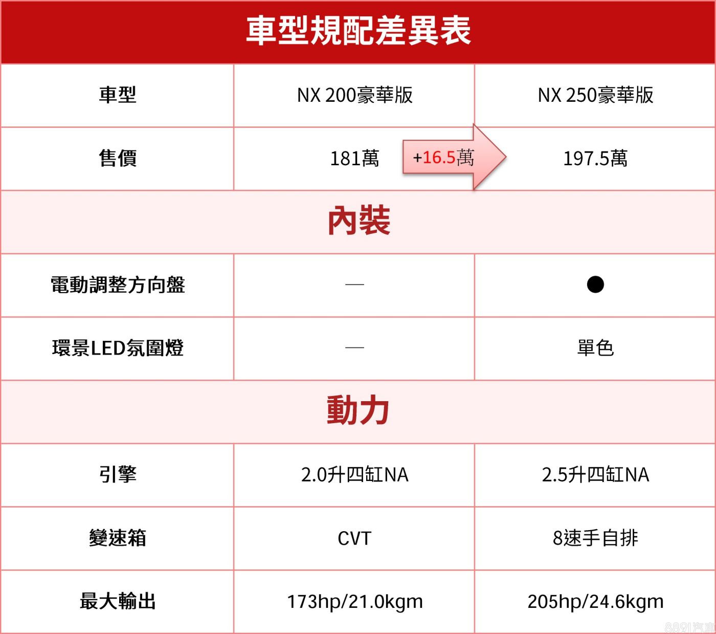 NX 250豪華版除了排氣量和輸出升級,也追加氛圍燈、電動調整方向盤等更有「豪華味」的配備,但說實話在這個預算範圍內,消費者最重視的應該還是C/P值,在油耗、稅金同步提高的前提下,推薦值自然沒那麼高。