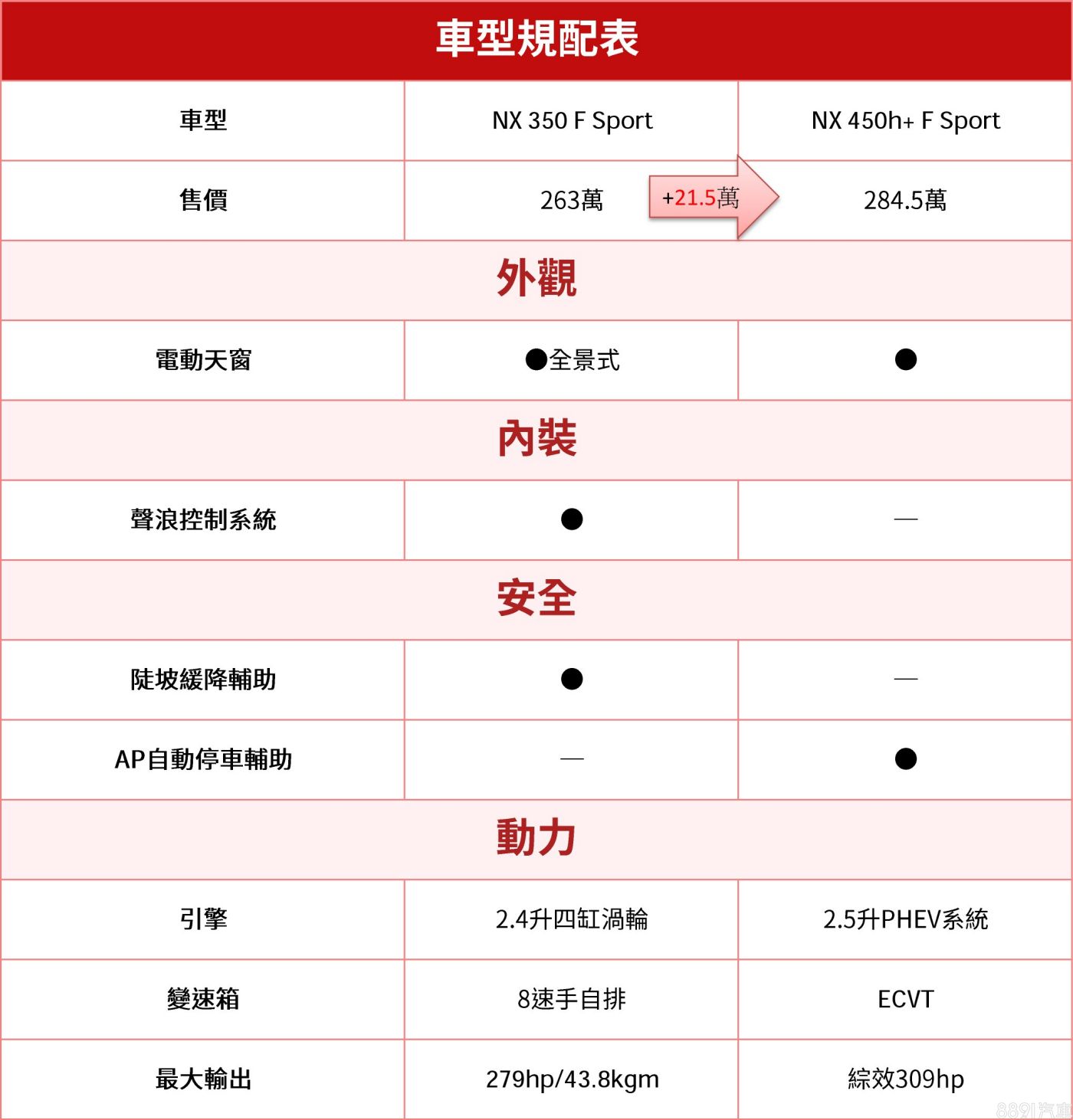 頂規NX 450h+ F Sport則是基於NX 350 F Sport配備水準,再加入PHEV動力,成為車系中身價最高的旗艦車型。不過像是全景天窗在450h+降級為小尺寸電動天窗,確實美中不足。