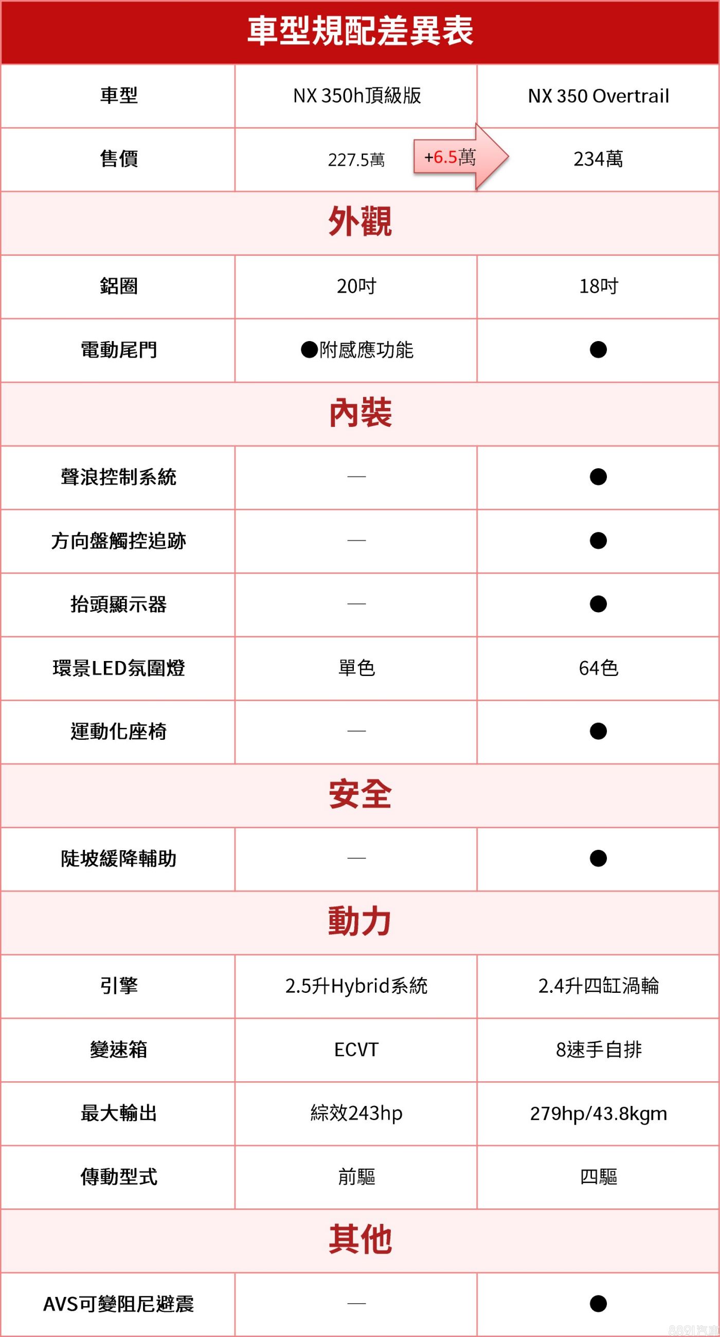 Overtrail版本主打現在流行的Outdoor風格,獨特的內外扮相,加上加高15mm的懸吊,再搭配原廠新的渦輪動力及四驅設定,配備也不差,不過對於Lexus多數依舊趨於保守的客群來說,吸引力可能不是太大。