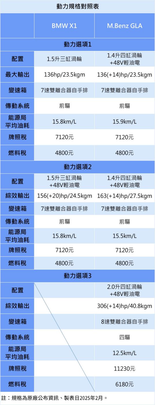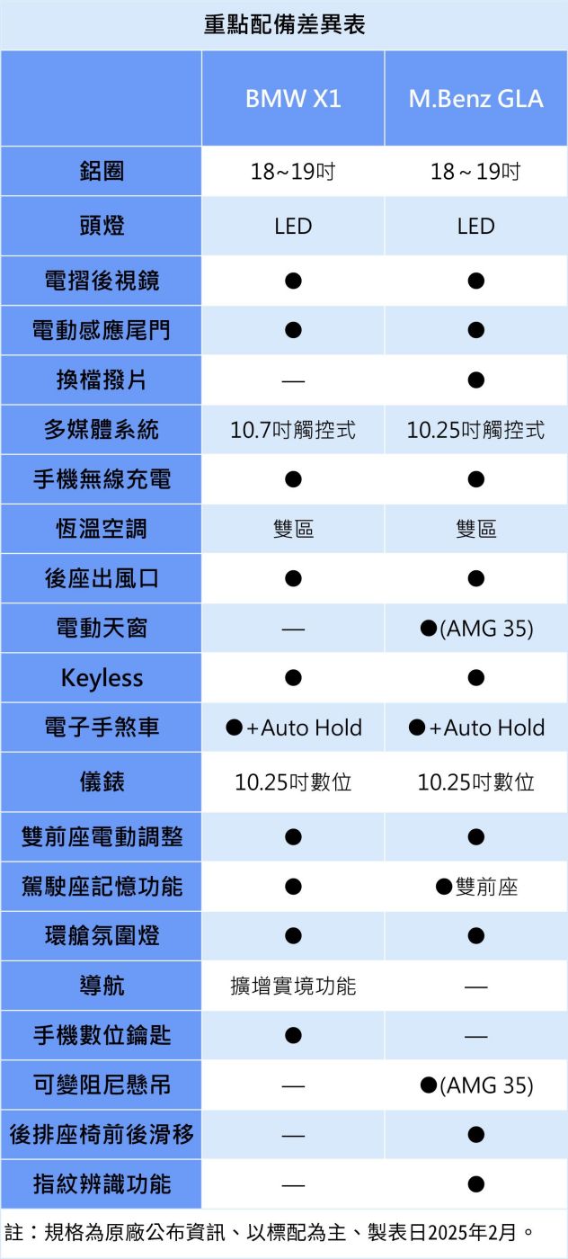 兩車差異最明顯的是價格帶,GLA價格區間拉到294萬元,主要是因為有GLA 35 AMG車型所致,目前X1並無相應性能車型,如果只單獨羅列GLA180、GLA200兩款主力販售車款,價格帶就會是203~222萬元,在主力販售車型部分仍是完全對上。