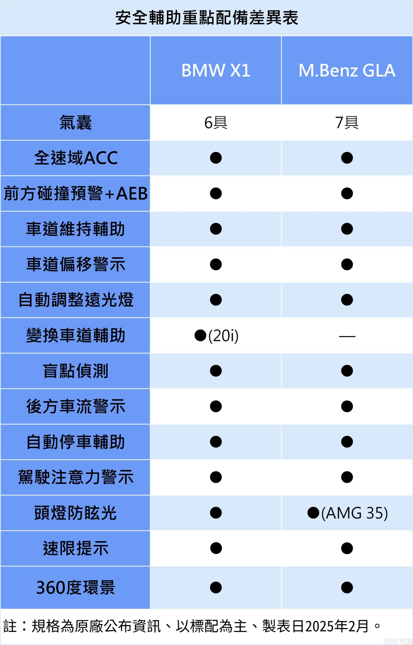 現在半自動駕駛平價車都有了,更別提跨入豪華等級,全速域ACC、前方主動煞停都是基本,兩車也都加入360度環景、自動停車輔助等,在都會、高速等情境下都是有安全保障的。兩車安全配備只差兩個地方,GLA多出膝部氣囊、X1多出主動變換車道輔助,個人會比較想要主動變換車道功能,高速公路開ACC時很好用,方向燈一打,自動幫你變換車道,長途駕駛更舒適!