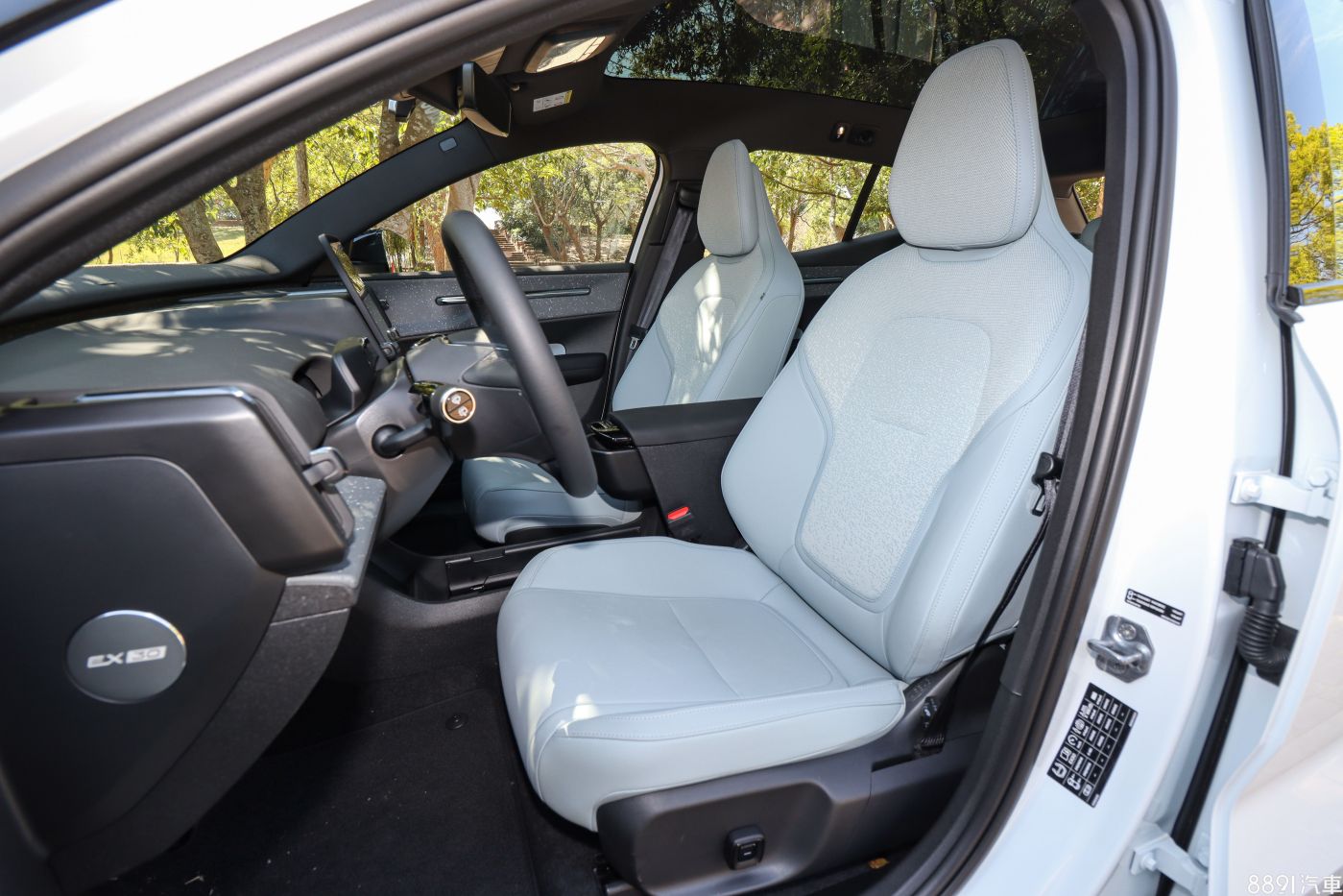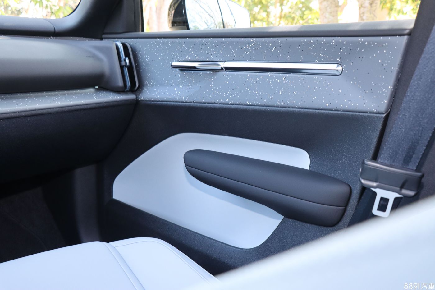 EX30在國內有3種內裝風格,本次試駕的頂規Ultra版採用「Breeze微風藍」車室,包含儀錶臺、車門板及座椅都是淡淡的藍色,中控台及門板上緣搭配「星砂微粒嵌飾」,雖是環保材質製造的硬塑料件,乍看下挺陽春的,但觸摸質感細緻,上頭繁星點點的裝飾也很有特色,加上時尚感十足的金屬門把,頗有畫龍點睛之妙。