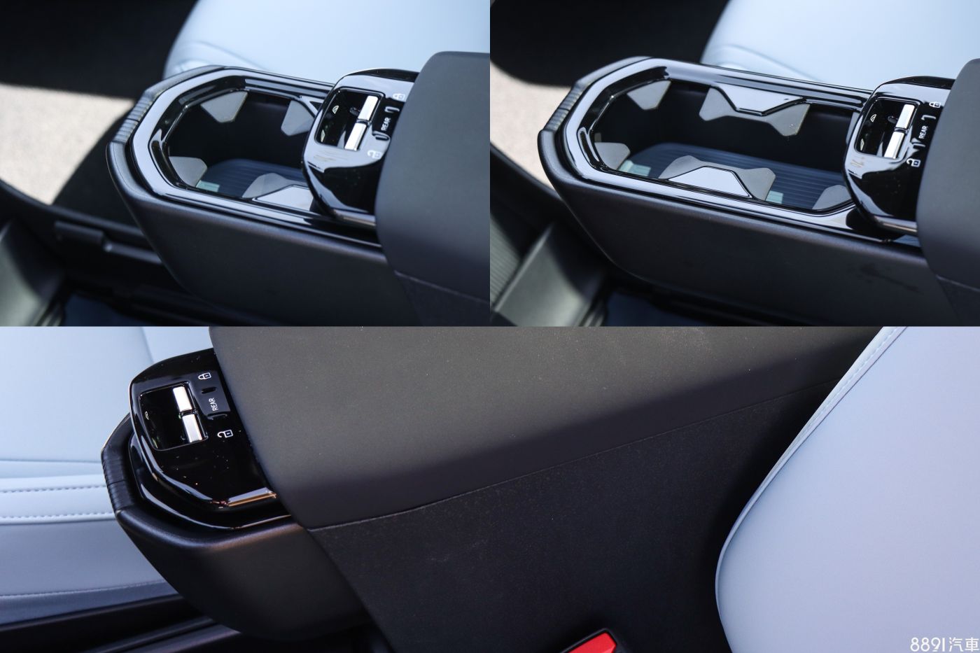 找不到車窗按鍵嗎?沒錯,這也是EX30需要適應的地方,那就是常見於門板的車窗控制總成,移到中央扶手了,常常要用時,都要想一下,而且要切換到後車窗,還要先按一下「Rear」鍵,多一道步驟,使用上稍嫌有些不直覺!