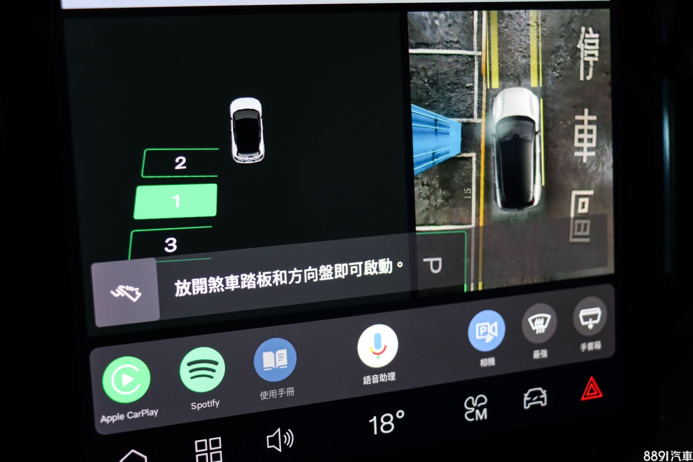 最新的PAP自動停車輔系統,不再需要自己排檔,偵測到多車位時,還可以自行選擇要停哪一格。透過螢幕上的「相機」快捷鍵,就會進入360環景畫面,再按下車輛旁的「輔助」鍵便能啟動自動停車輔助,依指示往前開,讓系統進行偵測,此時畫面便會跳出可用的停車格,若路徑上有複數停車格,駕駛還能依喜好點選想要的位置,接著就可以在車內欣賞EX30 DIY停車了!不得不說,這套系統偵測精準,執行自動停車也夠快速,就跟老司機一樣讓人放心!