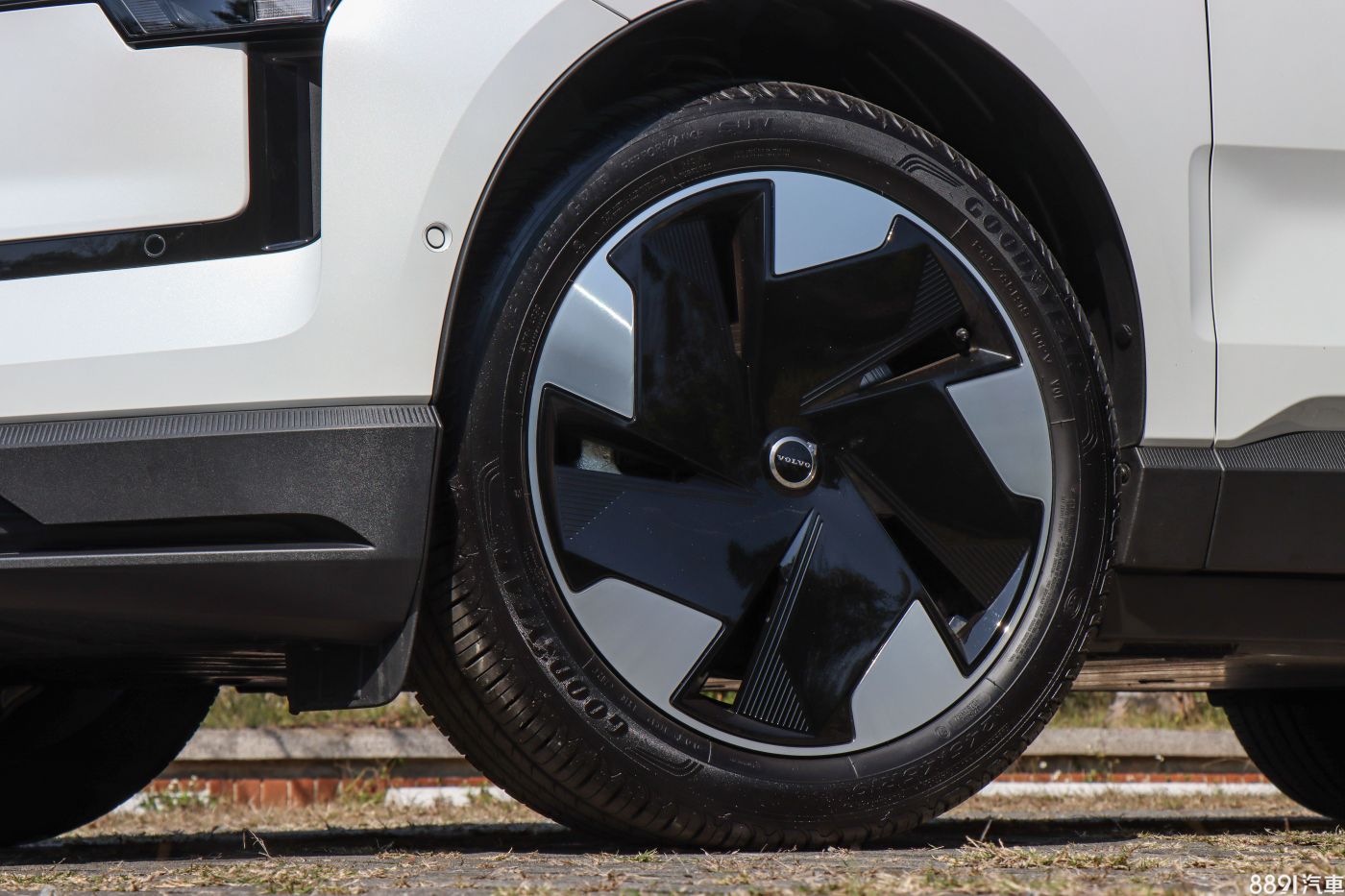 EX30頂規版搭載19吋五輻鋁圈,造型簡單俐落,上頭搭配黑色整流飾蓋,可以改善空氣力學、提升續航力,是電動車常見的配置,配胎為245/45R19固特異EfficientGrip Performance SUV胎,寧靜度與抓地力都頗具水準。