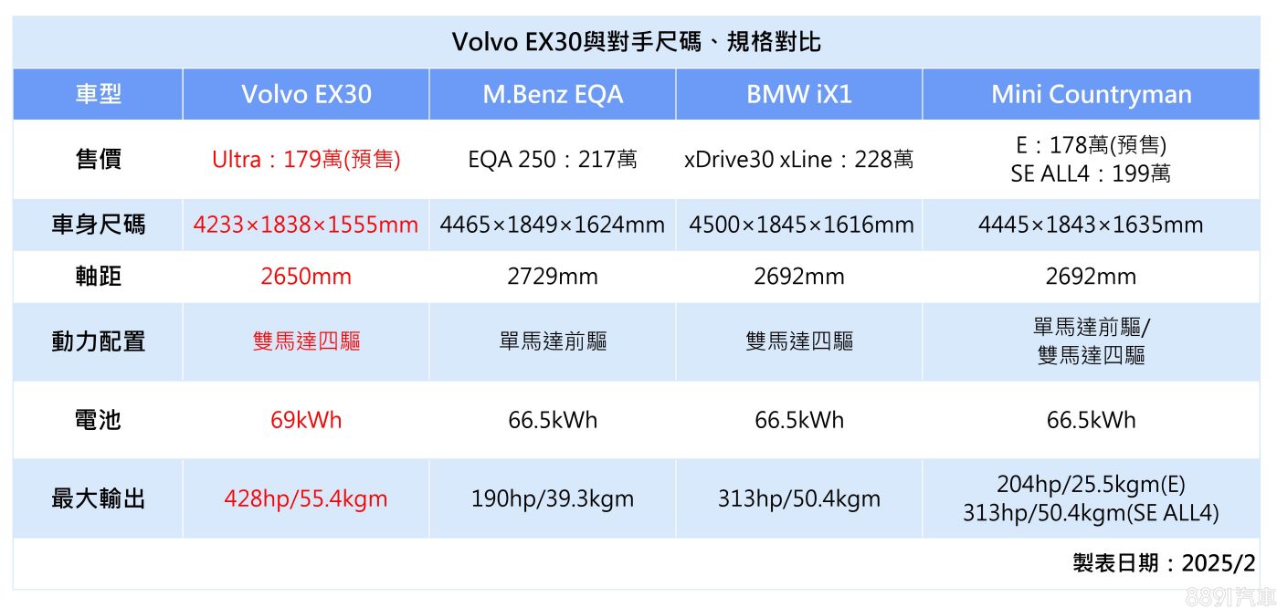 EX30是Volvo最新推出的電動休旅,尺碼、定位都比EX40更入門,將價格帶往下壓,鎖定的是空間需求不大的單身貴族,或是不生主義的夫妻檔,EX30賣得不只是品牌,各方面「技能樹」也都有高檔表現,首波雖帶來接單價179萬的雙馬達四驅版,但今年下半年已確定會有單馬達版,售價不排除下探150萬級距,屆時不只豪華車品牌要擔心,就連Hyundai、Kia、VW等平價品牌電車恐怕也會在掃射範圍內!