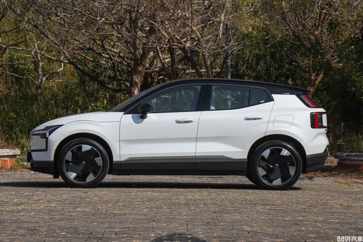 從車側視角,可以發現EX30與老大哥EX40類似,都是採用雙色車頂、上揚腰線、立體造型車門線條的組合,替這輛小跨界注入運動氛圍,而C柱後方靠近車頂的位置,鑲上車款銘牌,也是跟上潮流的一個小設計。