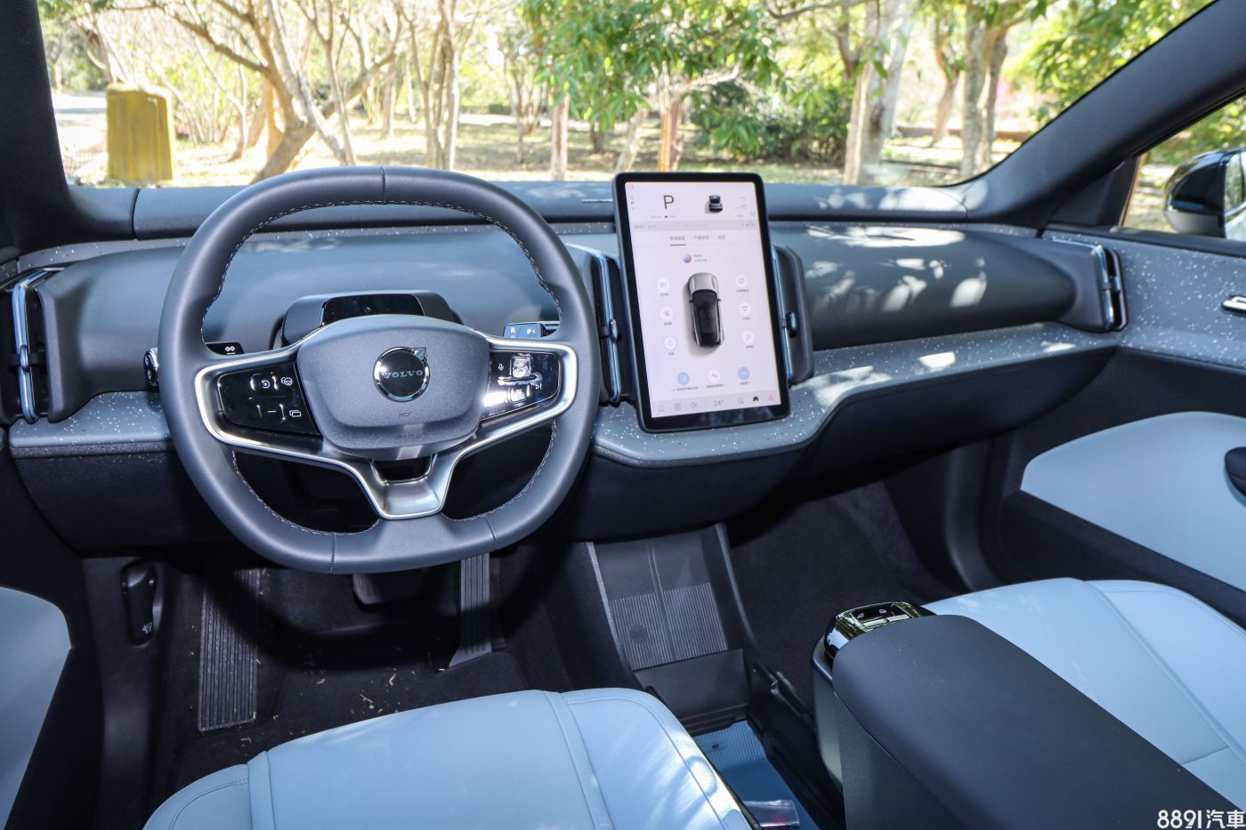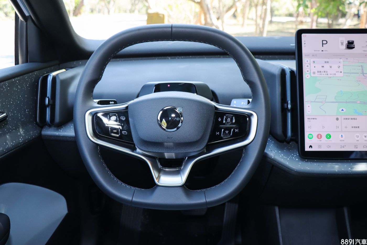 跟外表一樣,EX30車內也走「簡潔風」,以水平線條鋪陳,搭配簡單立體線條,沒有傳統的儀錶板、物理按鍵也是少之又少,絕大部分行車資訊、多媒體娛樂、空調介面,都整合在中央12.3吋觸控螢幕之中,座艙看起來十分清爽,但全部功能「All in One」,也更加考驗車廠螢幕UI介面的設計功力。