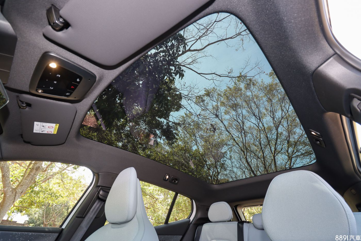 「全景式玻璃車頂」是EX30頂規獨享,尺寸相當大,從駕駛座頭部延伸至第二排,對於車內視野開闊度、室內採光明亮度都有幫助外,也能提升座艙質感,且原廠稱玻璃有經過處理,太陽能總通過率僅18%,試車當天氣溫回暖,尤其台中天氣有夠好,即使一整天在外頭跑,空調風量不用刻意開大,車內也不會太過曝曬。