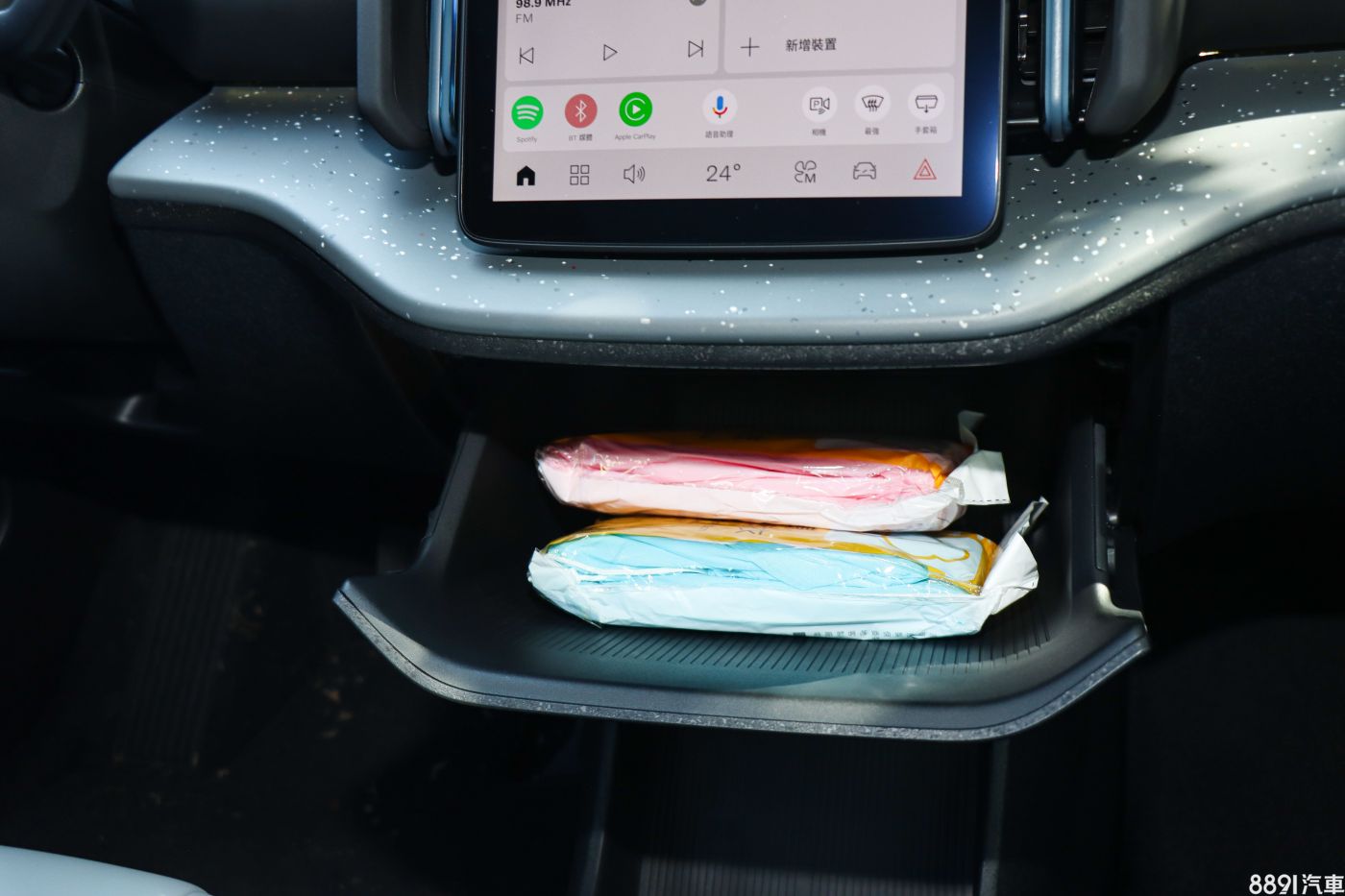 除了置杯架讓人驚喜外,EX30也有很多貼心的置物空間設計,像是中控下方有設計一個隱藏式手套箱,內部空間不算小,要放輕便雨衣、零錢包、小零嘴都可以,如果是女性買家,這裡也很適合存放化妝包或私人小物,隱密性高、拿取物品也便利。不過略嫌麻煩的是,這個手套箱沒有實體開關、只能電動開啟,且按鍵整合在螢幕中,較不利盲操作。