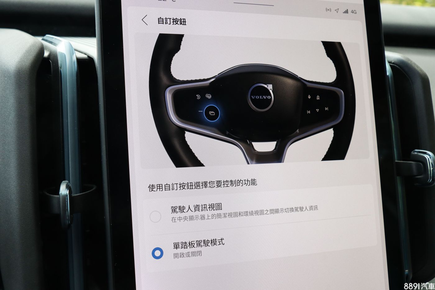 EX30沒有撥片、無法自主調整動能回收力道,但有提供「One-Pedle」單踏板駕駛模式,踩下踏板時進行加速,鬆開踏板即可減速,同時為電池充電,甚至可以使車輛達到完全靜止。該模式除了透過車輛設定啟動外,也能夠自訂按鈕一鍵切換,相當方便。