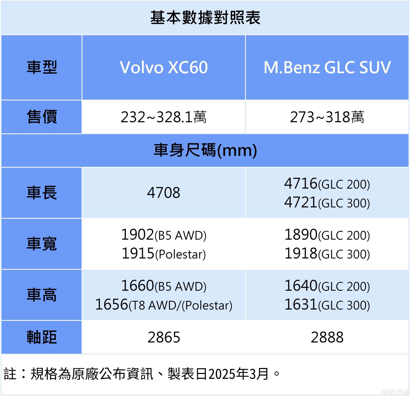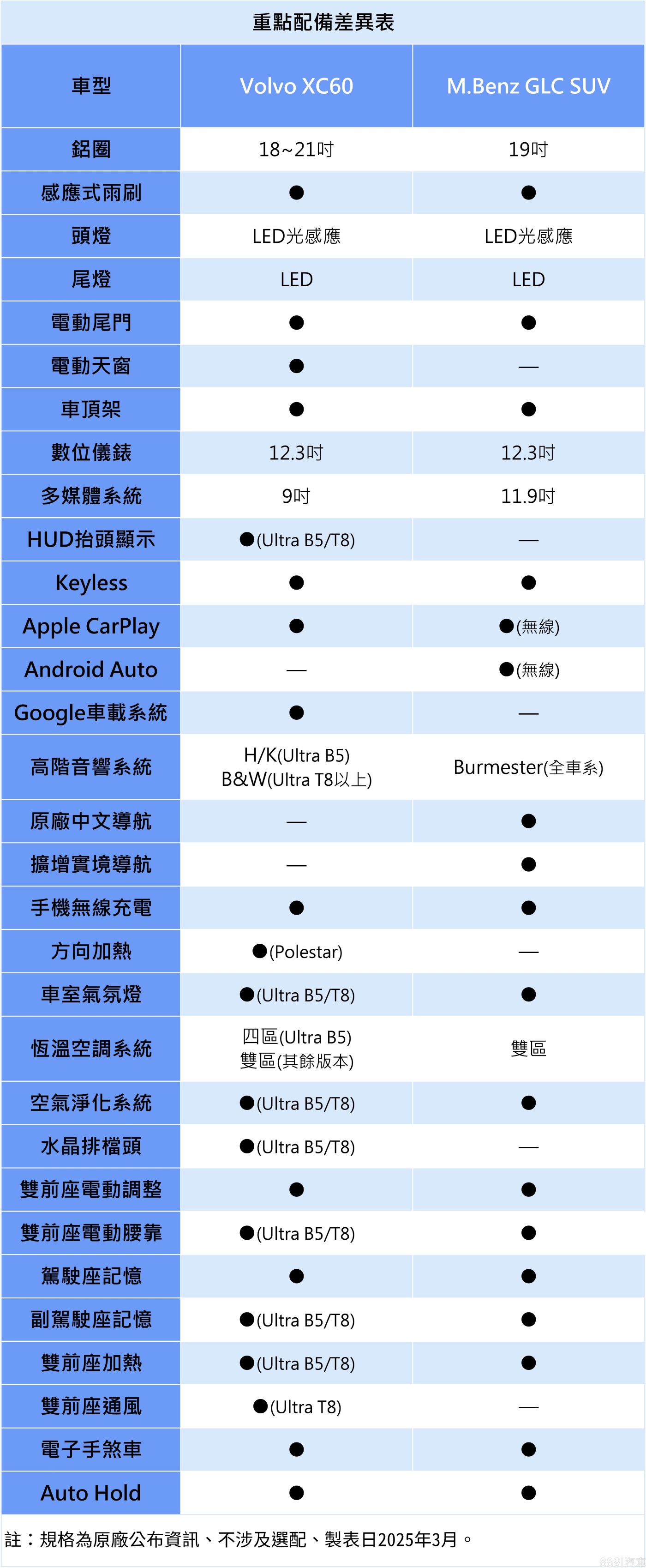 GLC是國內最熱銷賓士,2024年還以8143台,擠進台灣暢銷車排行第10名,銷售成績是Volvo XC60三倍還有找,顯見其受歡迎程度。不過「銷量≠產品力」,其實攤開規格表一比,可以發現XC60定價很具殺傷力,端出來的牛肉也誠意滿滿,屬於「惦惦吃三碗公」的類型,但要挑戰GLC這個「大魔王」決勝關鍵會在哪?