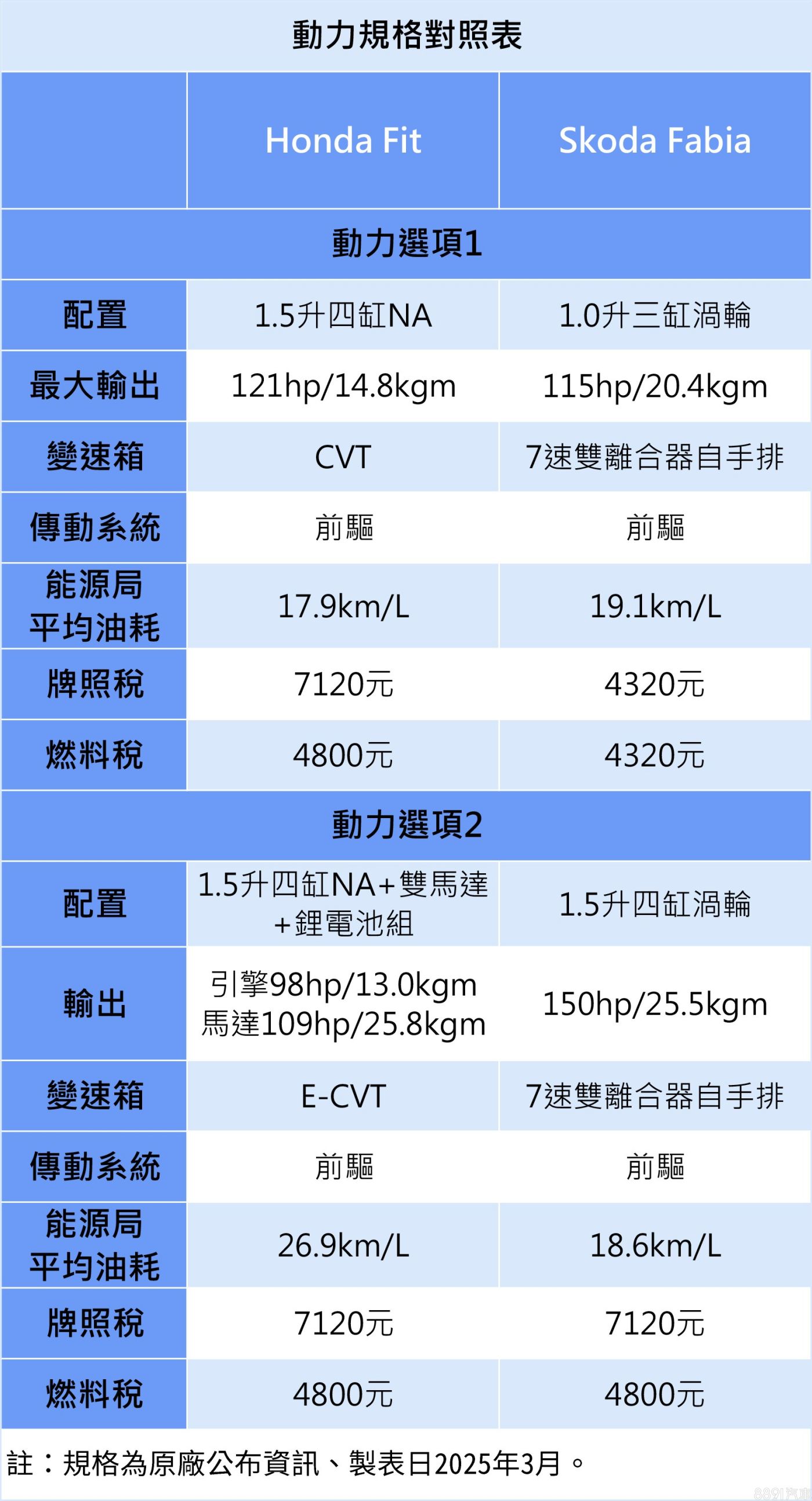 Fit提供汽油與油電兩種選擇,前者搭載1.5升「地球夢」四缸自然進氣引擎;後者則為台灣本田首度導入的1.5升e:HEV系統,後者繳出26.9km/L的亮眼平均油耗數據,多次拿下能源局油耗指南中最省油車款的頭銜,有Hybrid選項、是Fabia配置中所不能及的部分。不過全數提供渦輪汽油動力的Fabia,可選1.0升三缸設定,比起Fit在稅金上略有優勢;頂規車型則比起Fit有著更加強勁的輸出。