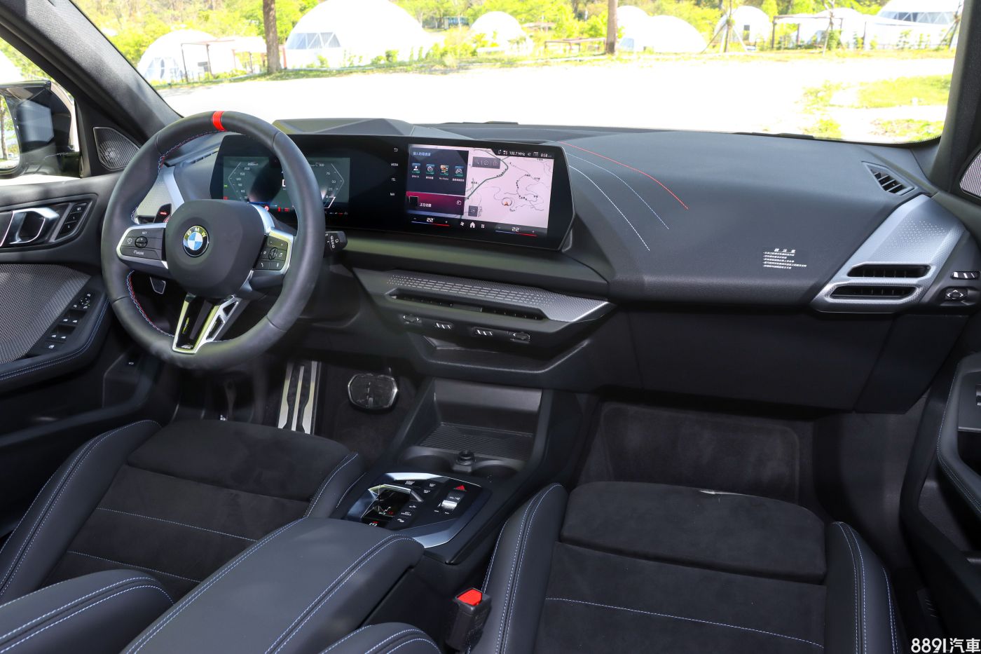 方向盤上的紅色定位環,設計源自拉力賽場,激烈轉動方向盤的情況下,定位環可以協助駕駛快速判斷方向盤轉向方位,市售車上則以營造性能氣息為首重。副駕駛前方儀錶台有M招牌三色縫線,細節頗為精緻。
