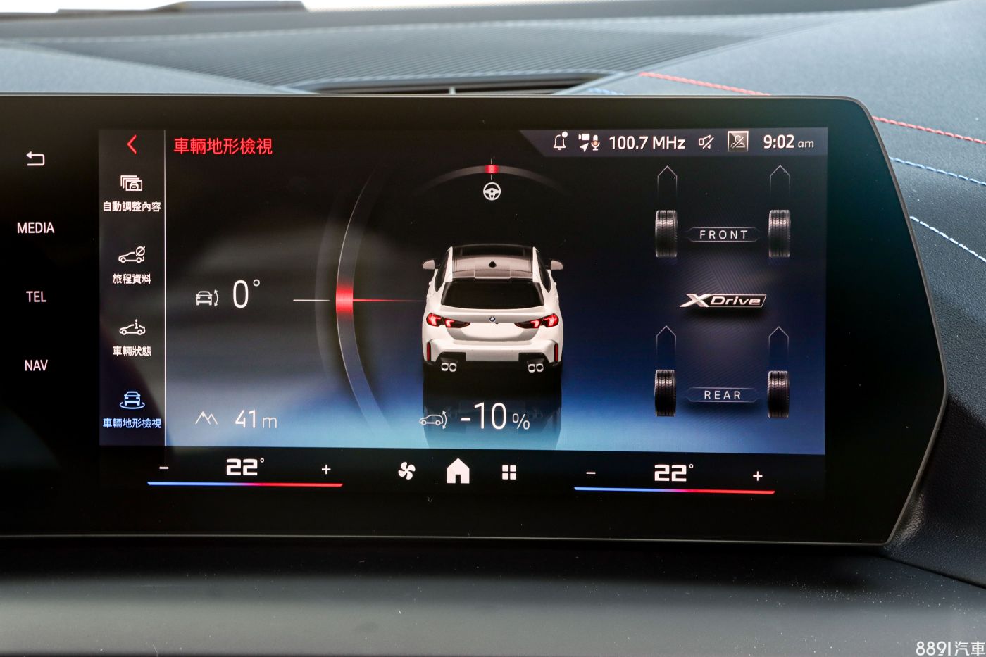 中控台中央10.7吋螢幕採用OS9系統,有個「車輛地形檢視」功能,會展示xDrive前後動力分配,多數情況下,你會看到前輪獲得的動力較多,至多是前後平均,畢竟M135是前驅架構,別期待會有什麼後軸動力較多,來個華麗甩尾畫面,雖然如此,但出彎時,前軸左右動力分配不同,內側較少、外側較多,這是差速器的功勞,避免內側輪空轉流失動力,也增強出彎反應。