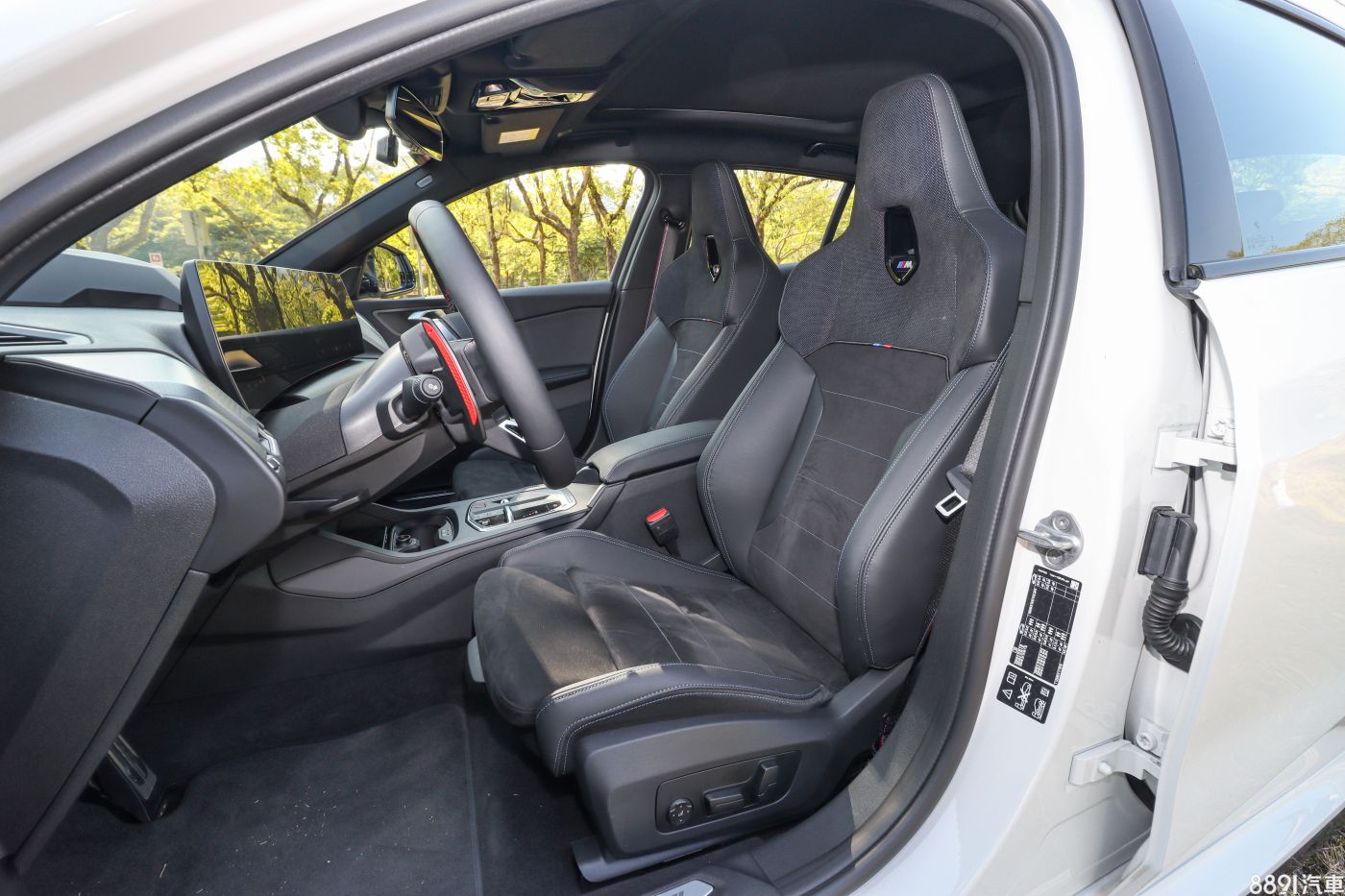 M跑車座椅為透氣皮革、麂皮搭配,鏤空處的M字夜晚會發光,而腰部可以充氣調整包覆性,加上多向電調與記憶功能,很難挑出有什麼不足之處。