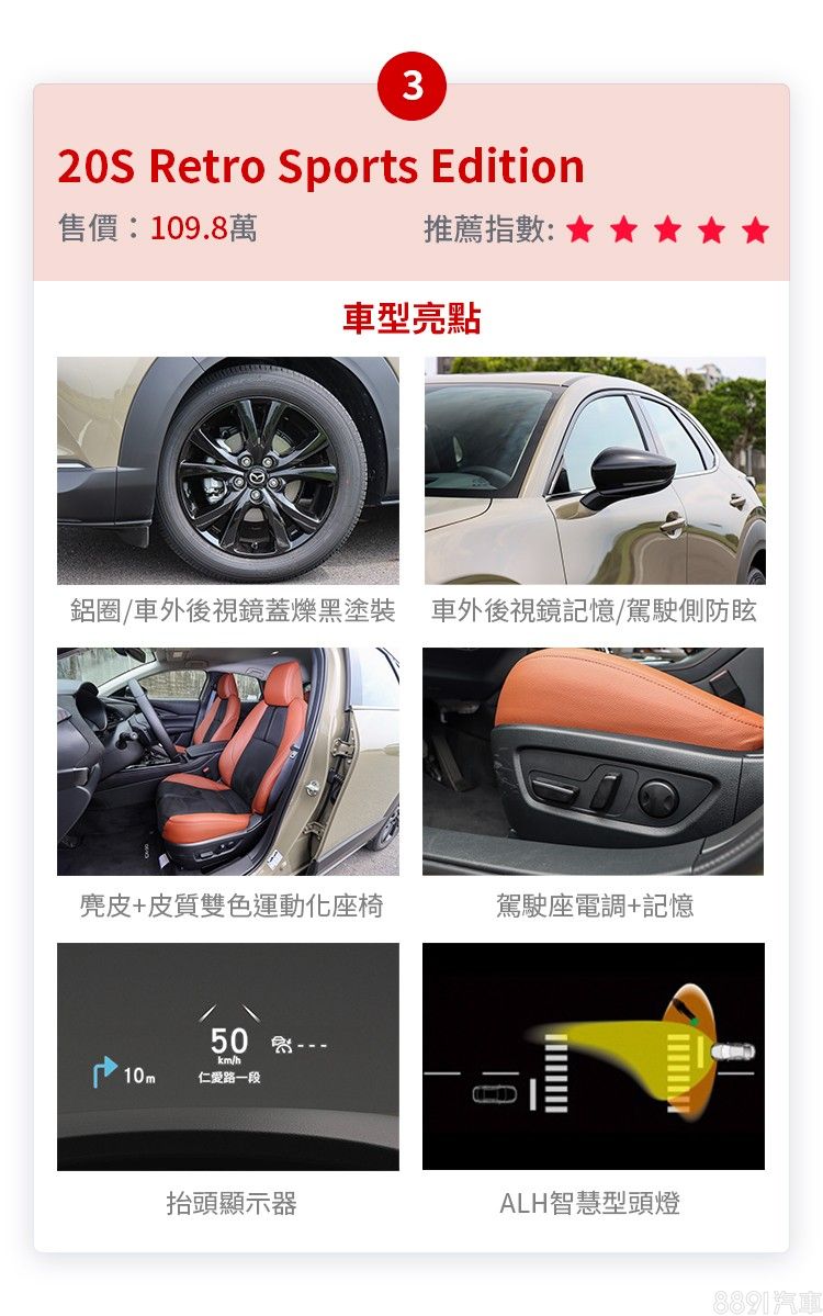 Retro Sports Edition多了HUD抬頭顯示、駕駛座電動記憶、麂皮雙色座椅、黑化鋁圈外觀、ALH智慧型頭燈,是一眼就讓人記住的CX-30風格款。雖然價格來到109.8萬,但相較提升的配備與質感,完全值得。